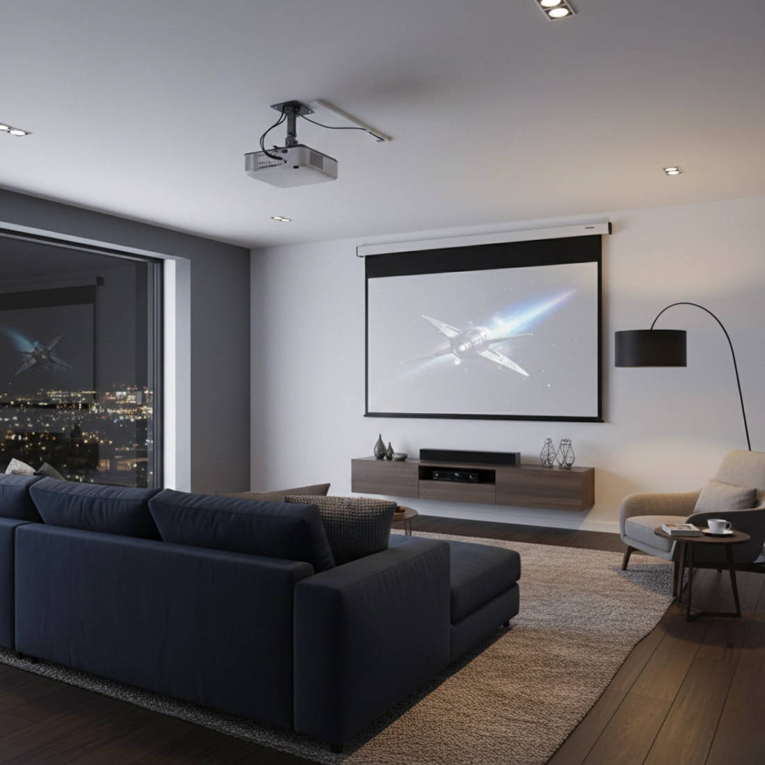 Ekran projekcyjny ręczny (rozmiar i format obrazu do wyboru) – idealny do filmów, prezentacji i transmisji sportowych.