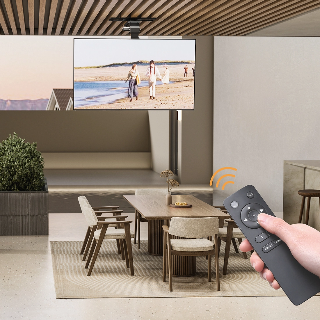 uchwyt sufitowy do tv, elektryczny uchwyt tv z obrotem, inteligentny uchwyt do tv, tv mount z Tuya, uchwyt do tv 86 cali, uchwyt tv z pilotem, smart uchwyt sufitowy, obrotowy uchwyt tv sufitowy