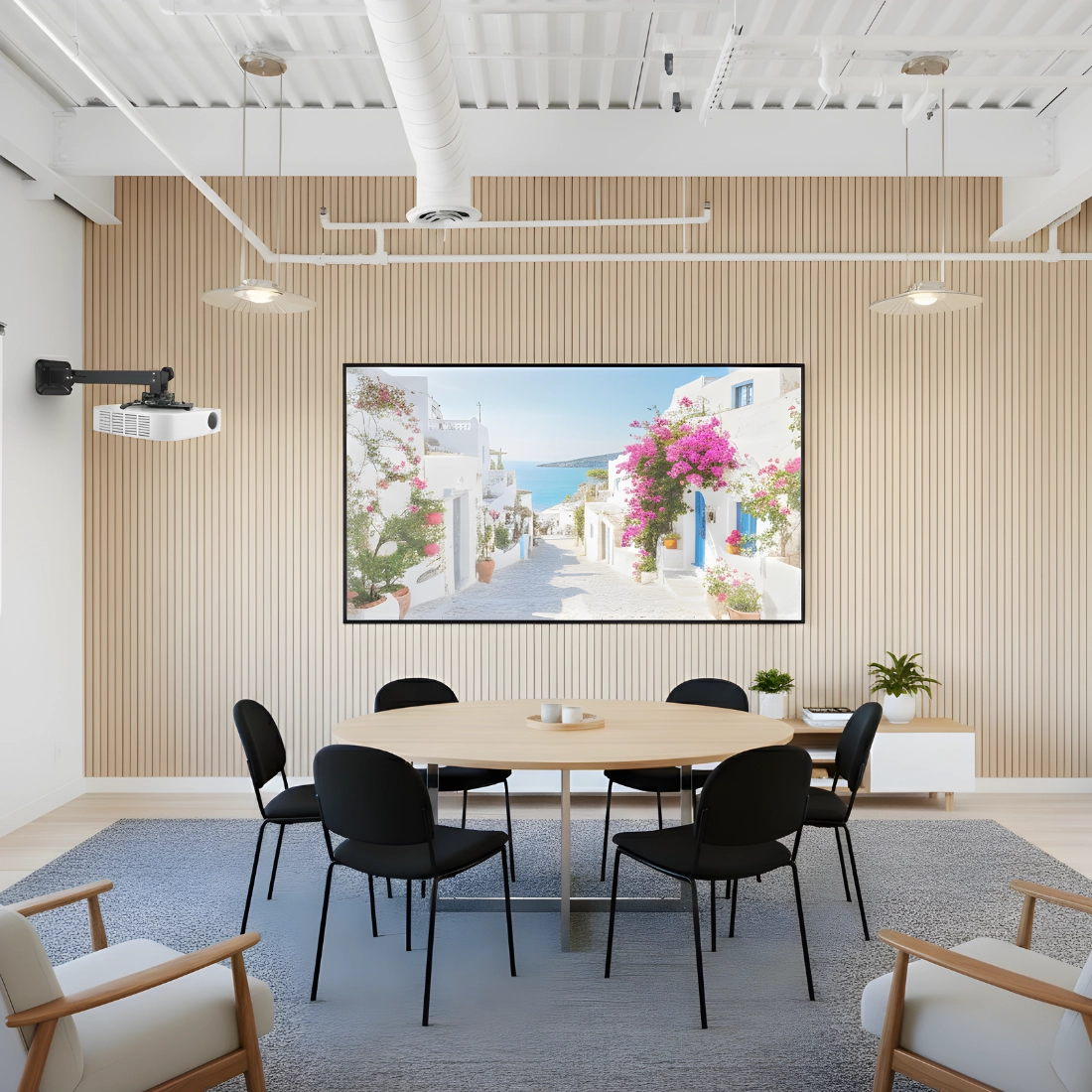 Ekran ramowy 16:9 – rozmiar do wyboru – dopasowanie do wielkości pomieszczenia.