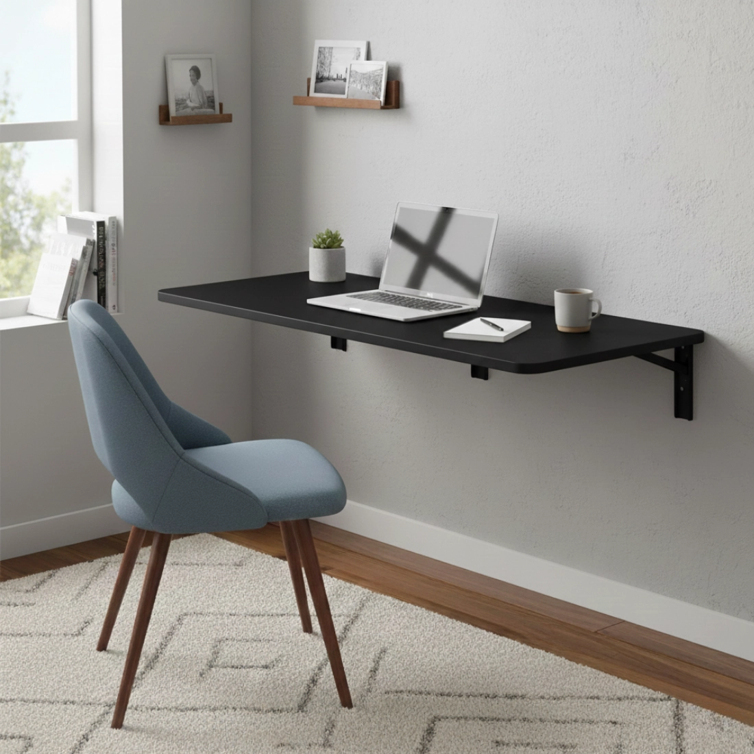 To rozwiązanie dla osób, które potrzebują pełnowartościowego blatu roboczego, ale nie chcą, aby biurko stale zajmowało miejsce w pomieszczeniu. Po zakończeniu pracy możesz je złożyć (90°) i odstawić przy ścianie lub do schowka. Czarny, minimalistyczny wygląd świetnie pasuje do nowoczesnych wnętrz i pomaga utrzymać spójny styl stanowiska pracy.