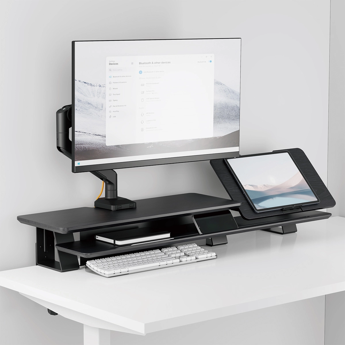 Ciesz się w pełni wszystkimi zaletami, jakie zapewnia Ci półka Spacetronik HUGEL 13. Wszystko dzięki tym małym detalom, w które została ona wyposażona. Na regulowanej części znajduje się specjalna blokada. Sprawi ona, że po ustawieniu kąta 55° położony na niej przedmiot (książka, laptop, tablet) nie spadnie na ziemię. Dzięki temu możesz ustawić ją idealnie, tak jak chcesz. Co więcej, dolna półka została wyposażona w wygodną, uniwersalną rynienkę. Będziesz mógł w niej trzymać zarówno swój telefon, jak i tablet. Trzymaj je zawsze pod ręką i to w taki sposób, żeby cały czas widzieć ich ekran. Dzięki temu Twoja przestrzeń do pracy stanie się jeszcze bardziej wielofunkcyjna. W tym samym momencie będziesz mógł wyświetlać potrzebne Ci informacje na monitorze, laptopie, tablecie i telefonie. Twoje biurko zamieni się w profesjonalne wielofunkcyjne miejsce pracy z dużą przestrzenią do przechowywania.