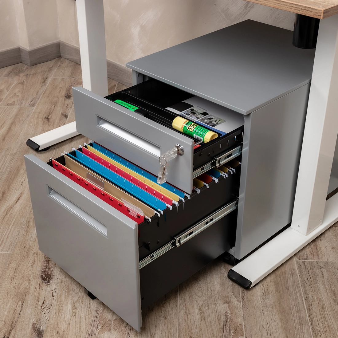 Schludna, dobrze zorganizowana przestrzeń w biurze to absolutna konieczność. Mobilny kontenerek pod biurko to idealne rozwiązanie do przechowywania dokumentów i artykułów biurowych. Wszystko, co potrzebujesz, masz pod ręką. Idealnie nadaje się zarówno do domowego biura, jak i firmy. Szafka jest wykonana z najwyższej jakości stali malowanej proszkowo, co przekłada się na wyjątkową wytrzymałość i stabilność - rozwiązanie na lata. Prosty, nowoczesny design sprawia, że szafka doskonale pasuje do każdego wnętrza. Centralny zamek to gwarancja bezpieczeństwa. Przechowuj dokumenty i wartościowe przedmioty w jednej z dwóch zamkniętych szuflad. Dzięki zintegrowanym kółkom można ją w łatwy sposób przemieszczać. Szafka jest prawie gotowa do użycia, wystarczy, że zamonutujesz kółka (nie potrzebujesz do tego żadnych narzędzi).