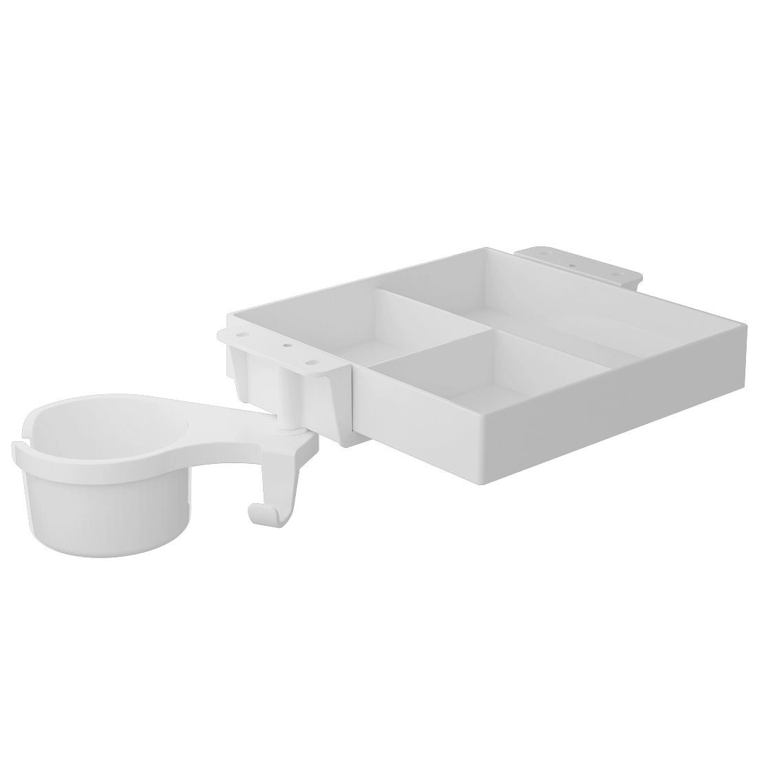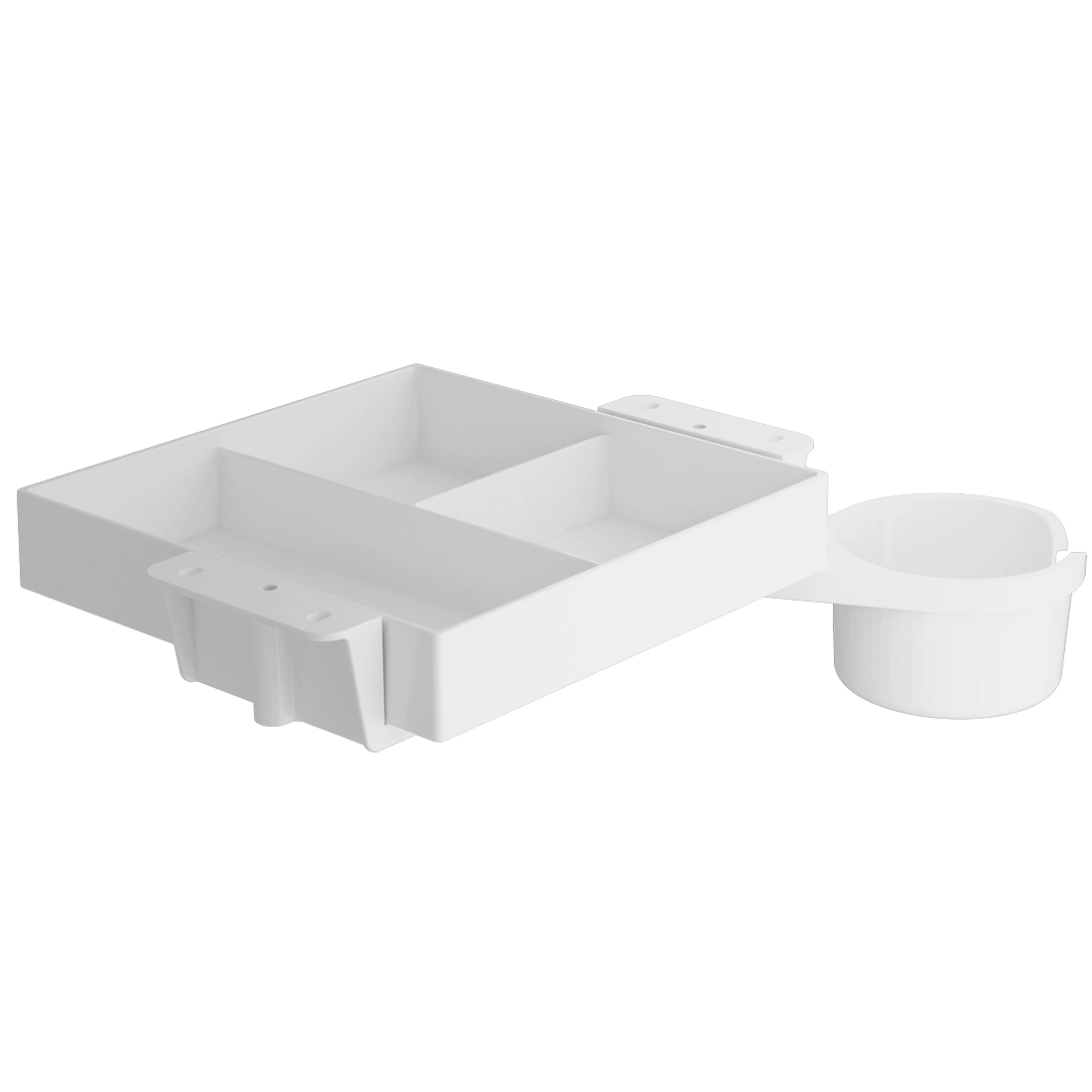 • Szuflada z uchwytem na kubek do montażu pod blatem. To idealne rozwiązanie dla lepszej organizacji i zwiększenia przestrzeni w miejscu pracy. W kolorze białym. 3 przegródki. Wymiary: 210x210x45mm. Udźwig: 5 kg.