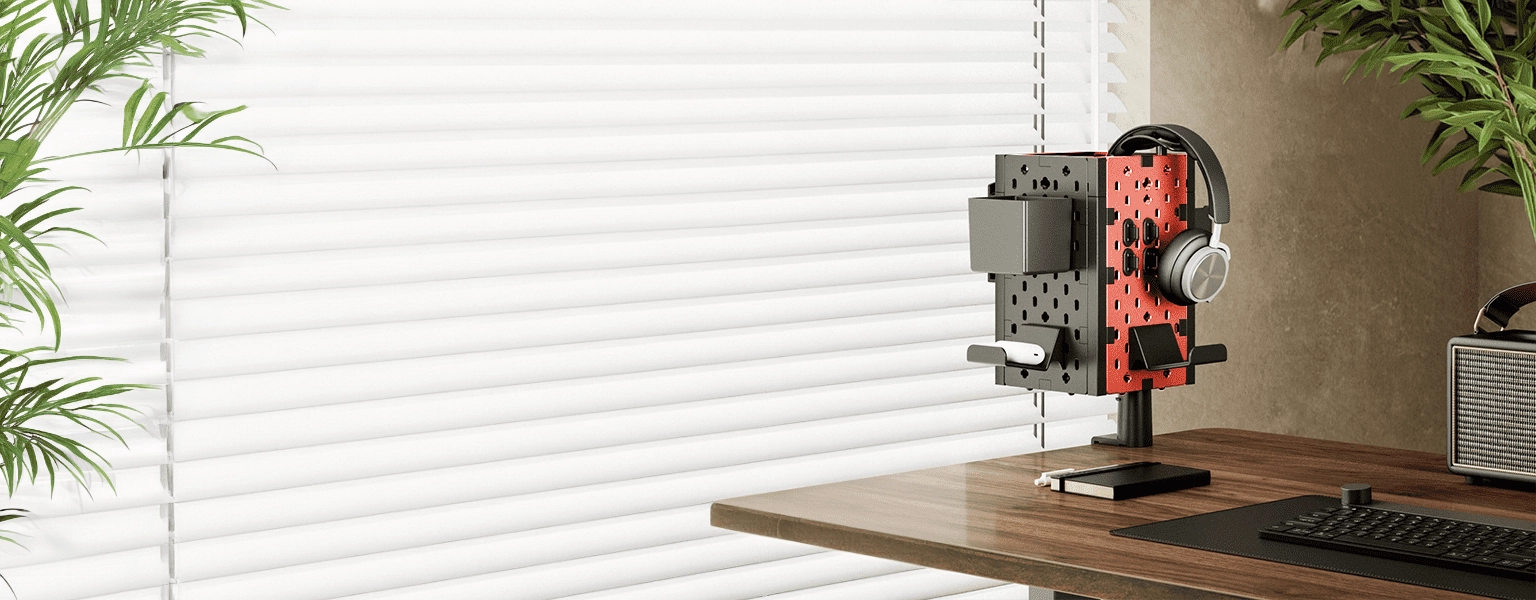 W zestawie oprócz 4 modułowych części perforowanych możesz znaleźć uchwyty na artykuły piśmiennicze, na kubek, na pady, dwa typy uchwytu na słuchawki oraz uchwyty na kable. Jest to kompletny uchwyt biurkowy, dzięki któremu łatwo zorganizujesz akcesoria na biurku. To Ty decydujesz, w którym miejscu zamontujesz dany uchwyt i jak go wykorzystasz.