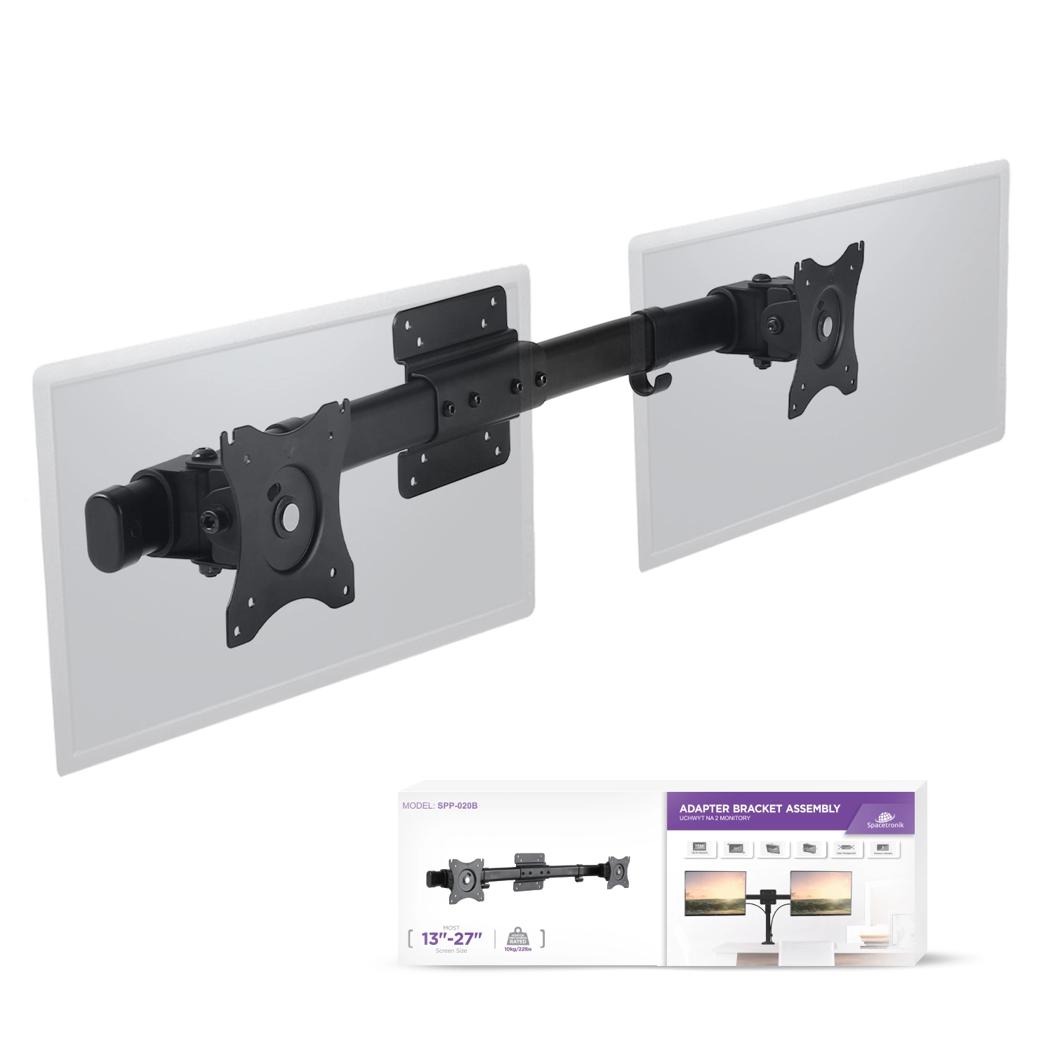 Dzięki wytrzymałej stalowej konstrukcji model SPP-020B zapewnia stabilny uchwyt dla dwóch monitorów o przekątnej od 13 do 27 cali każdy i wadze do 10 kg.