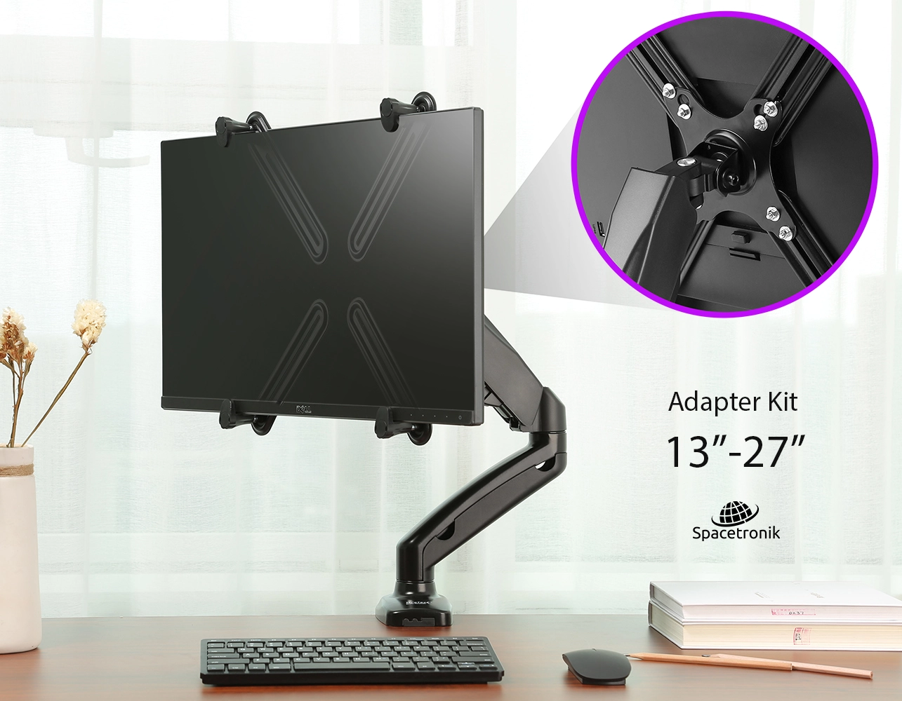 Ten adapter obsługuje większość monitorów 13"-27" o grubości od 26,5 mm do 65 mm. Umożliwia zamontowanie monitora innego niż VESA na prawie każdym ergonomicznym ramieniu monitora i regulację w celu zwiększenia komfortu oglądania.