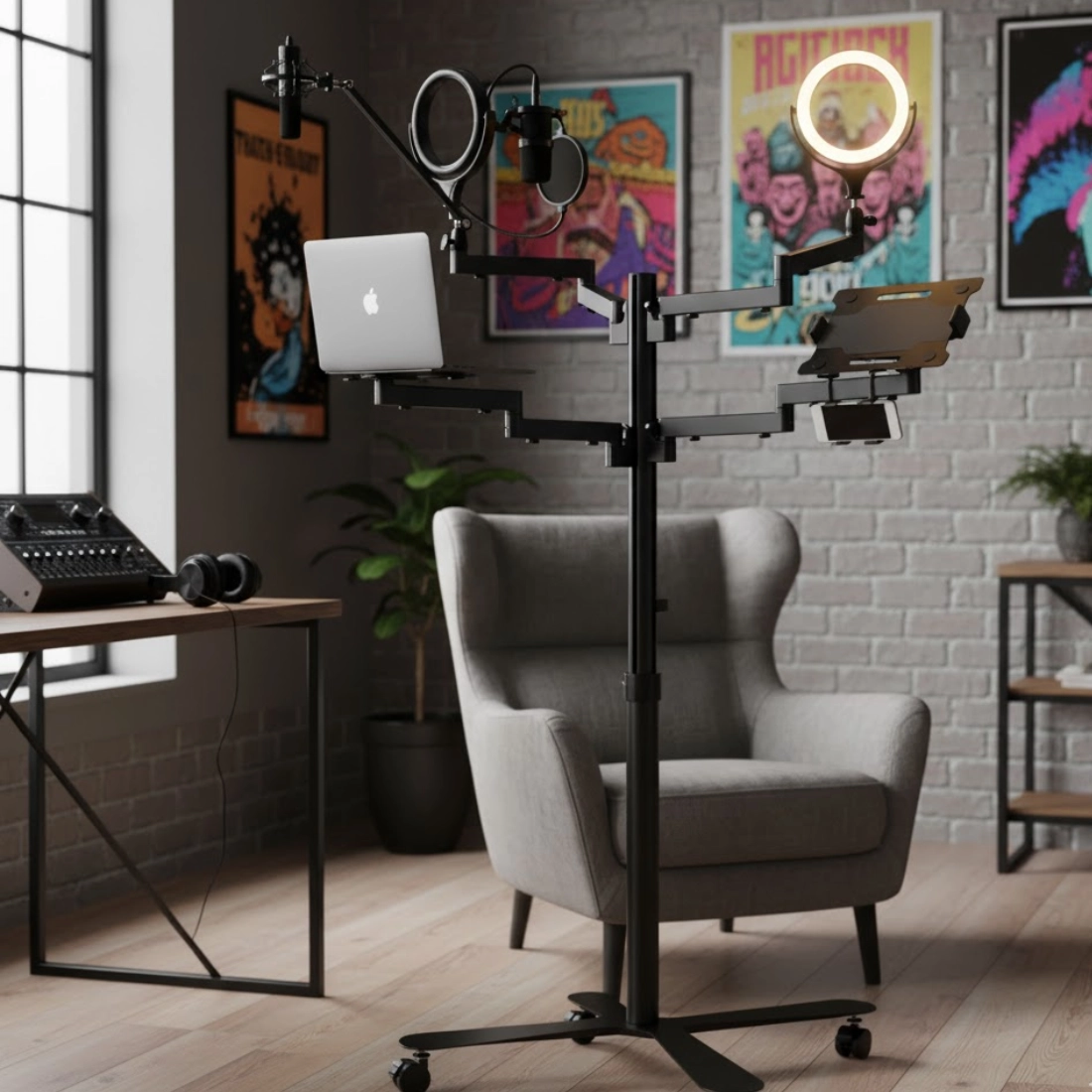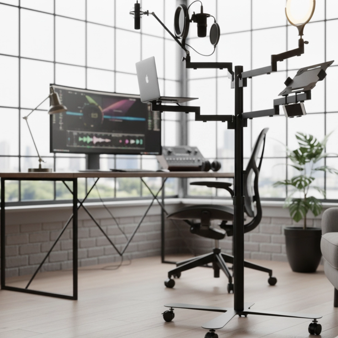 Płynna regulacja wysokości w zakresie 83,6–134 cm pozwala szybko dopasować ujęcie do webinaru, podcastu przy biurku czy prezentacji produktu z góry. Koniec z prowizorycznymi podstawkami — ustawiasz raz i działasz.
