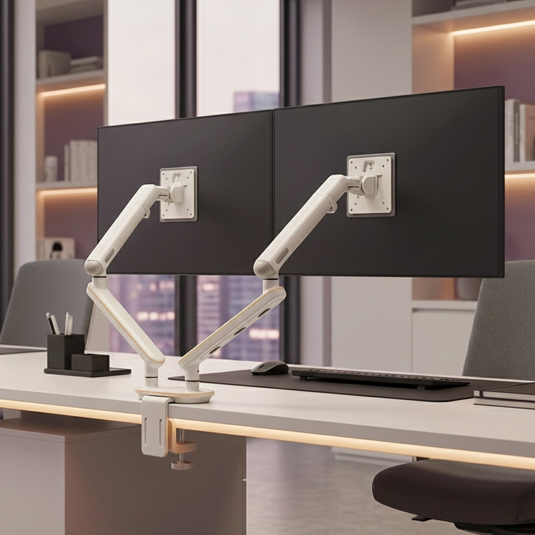 - Ergonomia — ustaw monitory na linii wzroku, zredukuj napięcie karku i zmęczenie oczu.