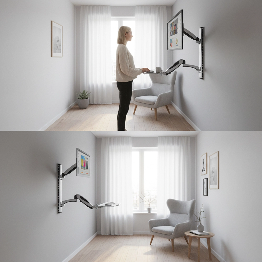 Innowacyjna, składana konstrukcja: Złóż ramiona i tackę płasko do ściany, gdy nie używasz stanowiska, i odzyskaj cenną przestrzeń w mieszkaniu lub biurze.