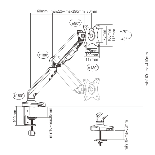 - Sugerowana grubość biurka: Zacisk: 10 ~ 85 mm Przelotka: 10 ~ 40 mm