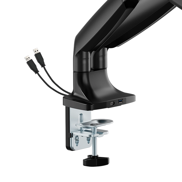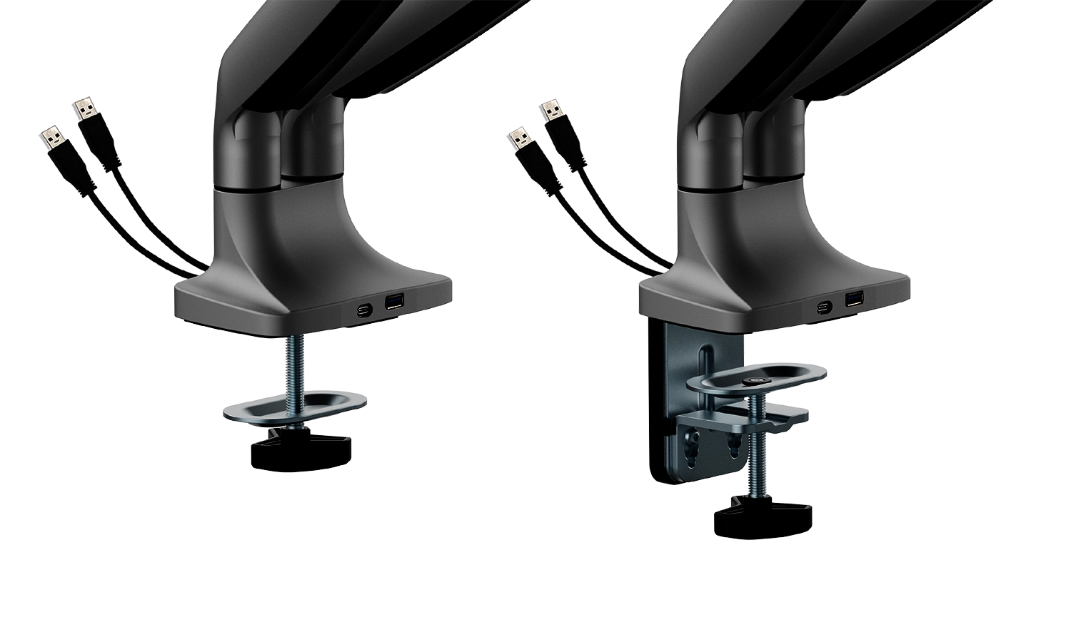 Podstawa uchwytu do monitorów Spacetronik SPA-S120B została wyposażona w dwa wejścia USB (USB-A, USB-C). Oznacza to, że z łatwością podłączysz pod nie np. swój telefon. Dzięki temu będziesz mógł np. ładować swojego smartfona bez potrzeby wstawania od komputera. Z uchwytem SPA-S120B możesz mieć pod ręką wszystko to, co jest Ci potrzebne do pracy.