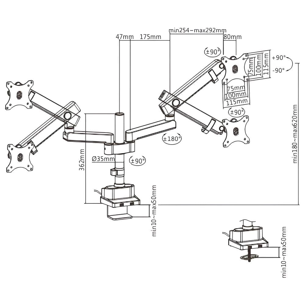 Uchwyt na monitory SPA-H120 został wyposażony w dwa rodzaje końcówek montujących. Wszystko to, by chronić Twoje meble. Dwa dostępne sposoby montażu to przelotka i zacisk. Zwłaszcza ta druga opcja może się dla wielu wydać interesująca. Montaż zaciskowy cechuje się brakiem potrzeby wiercenia. Wystarczy, że upewnisz się, że masz biurko o odpowiedniej, kompatybilnej grubości blatu (10-50 mm). Brak potrzeby wiercenia oznacza, że możesz bez problemu przekładać uchwyt z biurka do biurka. Nie zostawisz przy tym żadnych śladów użytkowania.