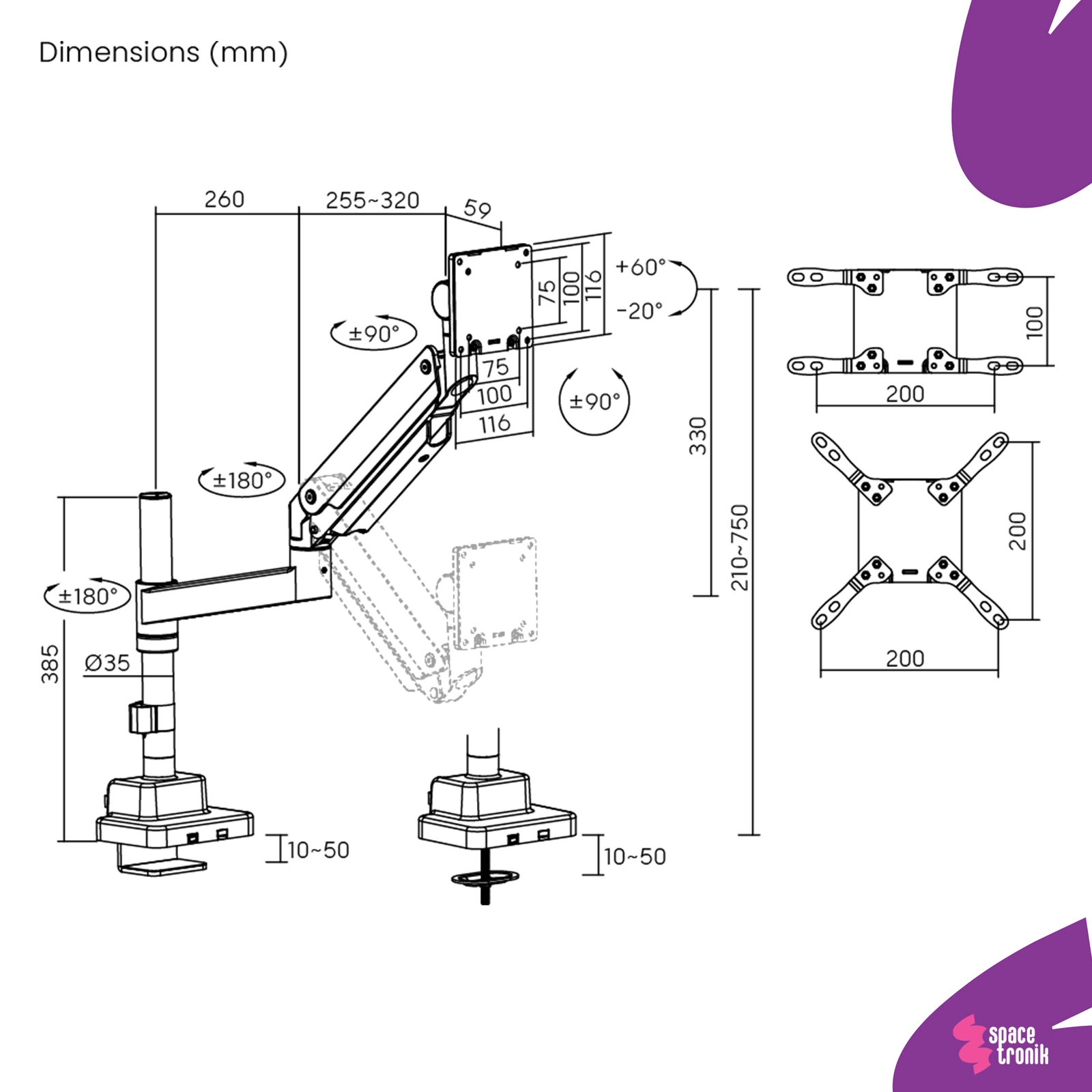 W celu zapewnienia jak największej uniwersalności i prostoty, stojak Spacetronik SPA-H212 możesz przymocować do biurka na dwa sposoby. Są to następująco zacisk i przelotka. Stosując ten pierwszy sposób montażu, nie zostawisz żadnych śladów użytkowania na swoim biurku. Co więcej, będziesz mógł z łatwością w każdym momencie odczepić uchwyt i przenieść go w inne miejsce. Mocowanie do blatu za pomocą przelotki wymaga od Ciebie przewiercenia blatu, jednak w zamian za to dostajesz maksymalną stabilność. Uchwyt biurkowy do monitora pozwala Ci na dwa rodzaje montażu i tylko od Ciebie zależy, który z nich wybierzesz.