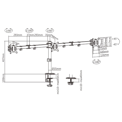 - Sugerowana grubość biurka: Zacisk: 10 ~ 85 mm Przelotka: 10 ~ 40 mm