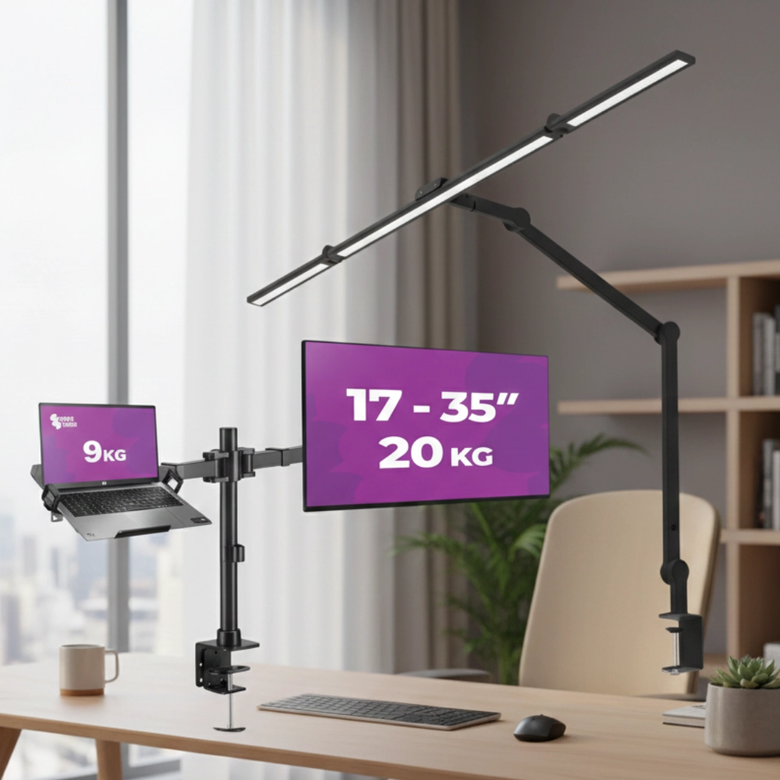 Chcesz uporządkować biurko, poprawić ergonomię i jednocześnie mieć światło dokładnie tam, gdzie go potrzebujesz? Ten zestaw łączy trzy elementy, które robią największą różnicę w codziennej pracy: mocny uchwyt na monitor i laptop, jedną z lamp biurkowych z serii Glow (wybieraną przez klienta na sklepie) oraz adapter, który pozwala zamocować lampę na ramieniu monitora. Efekt? Więcej miejsca na blacie, lepsza pozycja podczas pracy i czyste, profesjonalne stanowisko — bez plątaniny kabli i bez kompromisów.