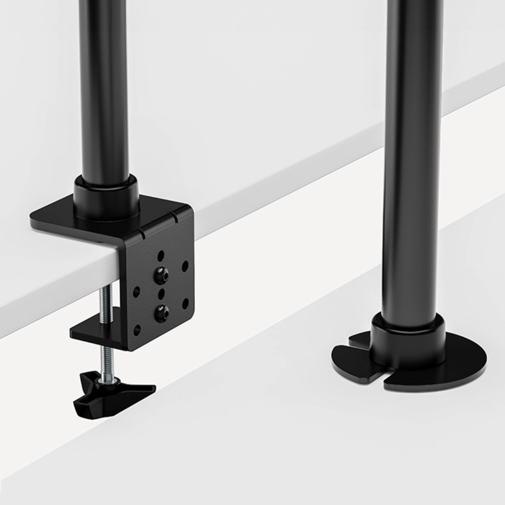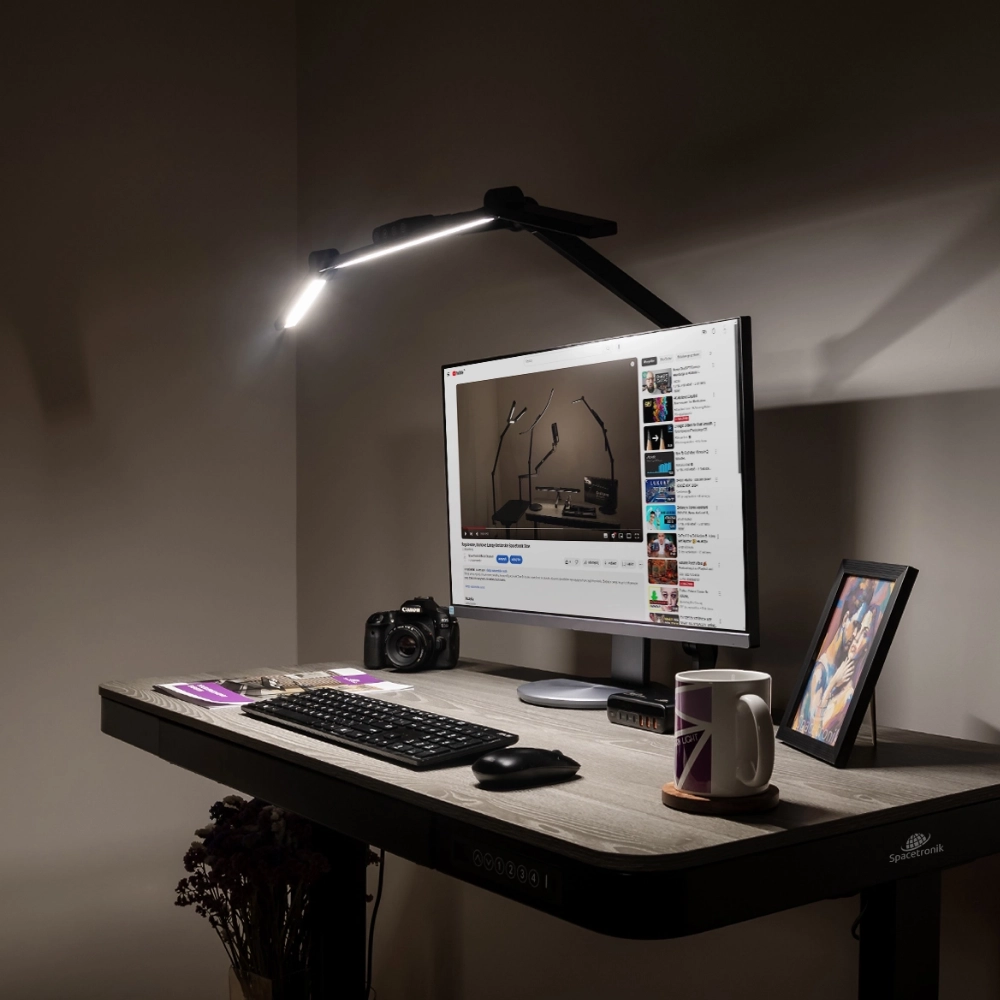 Połączenie uchwytu i lampy na jednym „ramieniu” ułatwia prowadzenie przewodów i zostawia więcej wolnej przestrzeni na blacie. To świetna opcja do biura, domowego gabinetu, stanowiska do nauki, a także dla osób, które tworzą treści i chcą mieć czyste tło oraz wygodny dostęp do światła i ekranu.