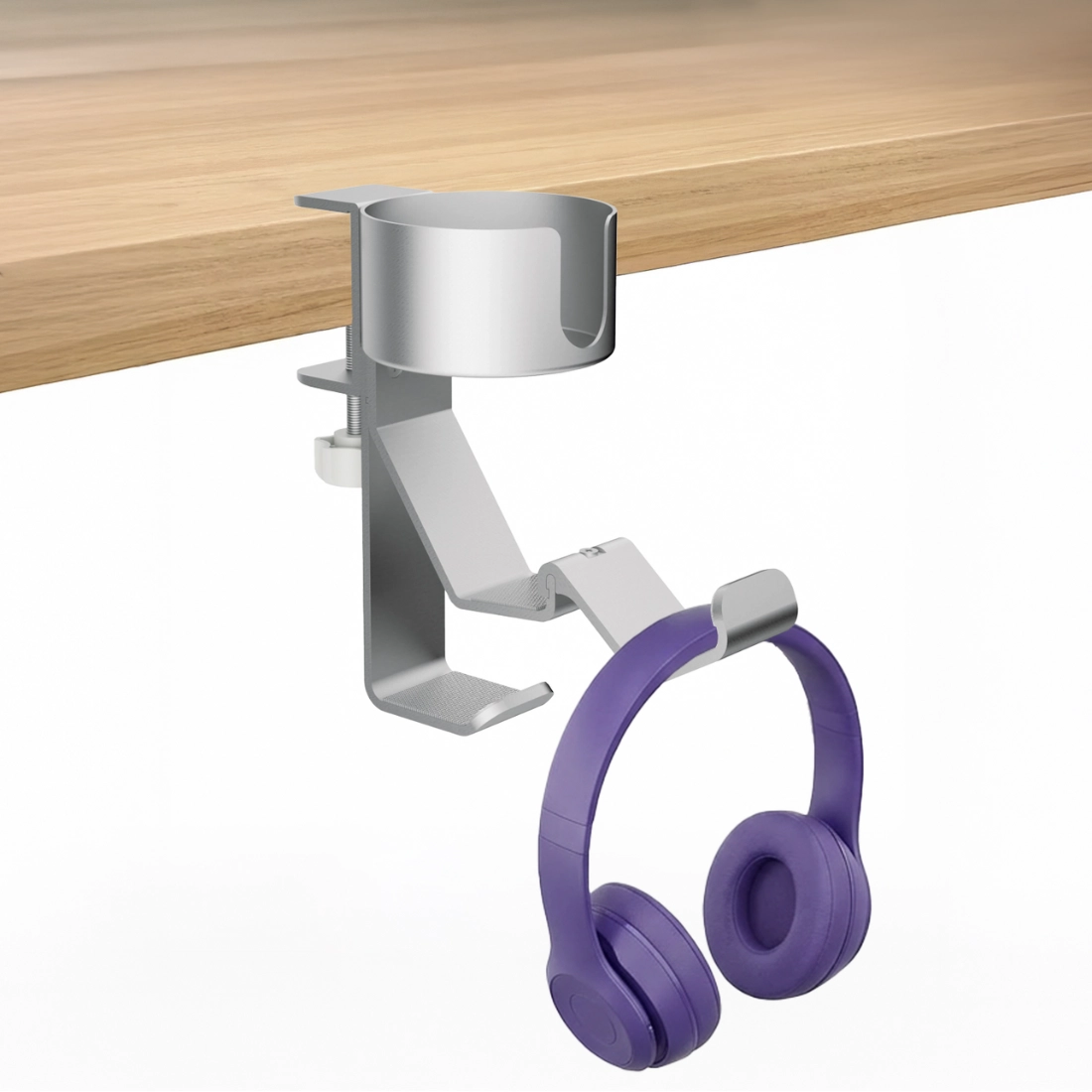Niewielki organizer nie zajmuje przestrzeni roboczej, a realnie poprawia wygodę. Uchwyt na kubek i haczyki na słuchawki porządkują najczęściej używane akcesoria i pomagają utrzymać estetyczne, schludne stanowisko.
