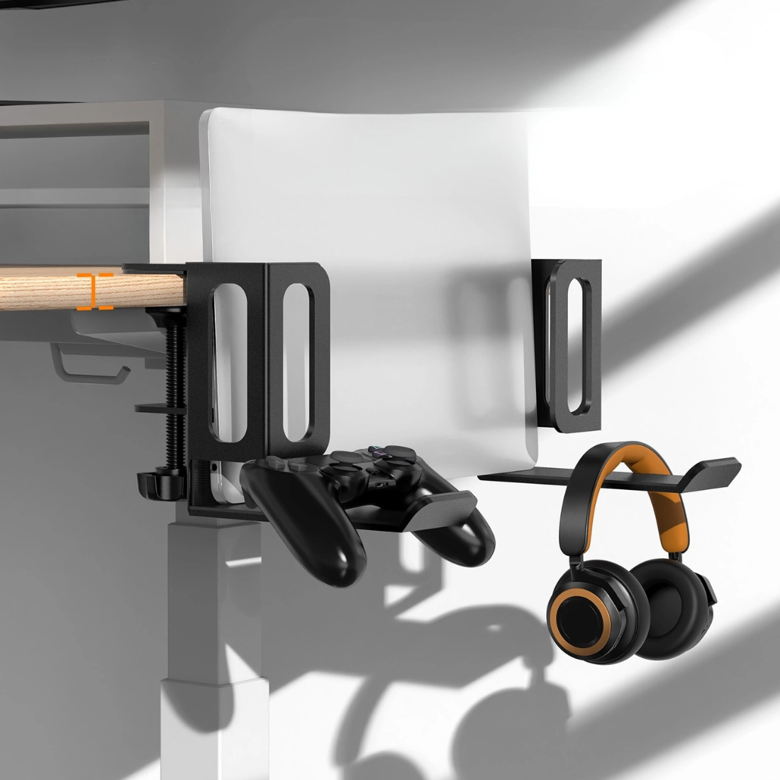 Jedna konstrukcja pełni dwie funkcje – pionowy uchwyt na laptopa oraz wieszak na słuchawki lub kontroler. Sprzęt jest zawsze pod ręką, ale nie leży na blacie, dzięki czemu Twoje stanowisko wygląda schludnie i profesjonalnie.
