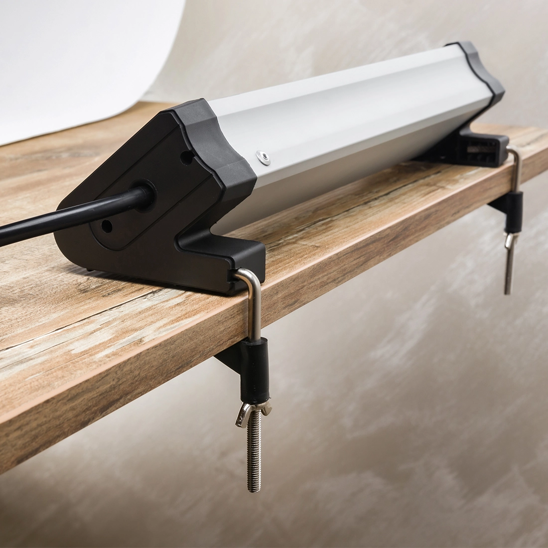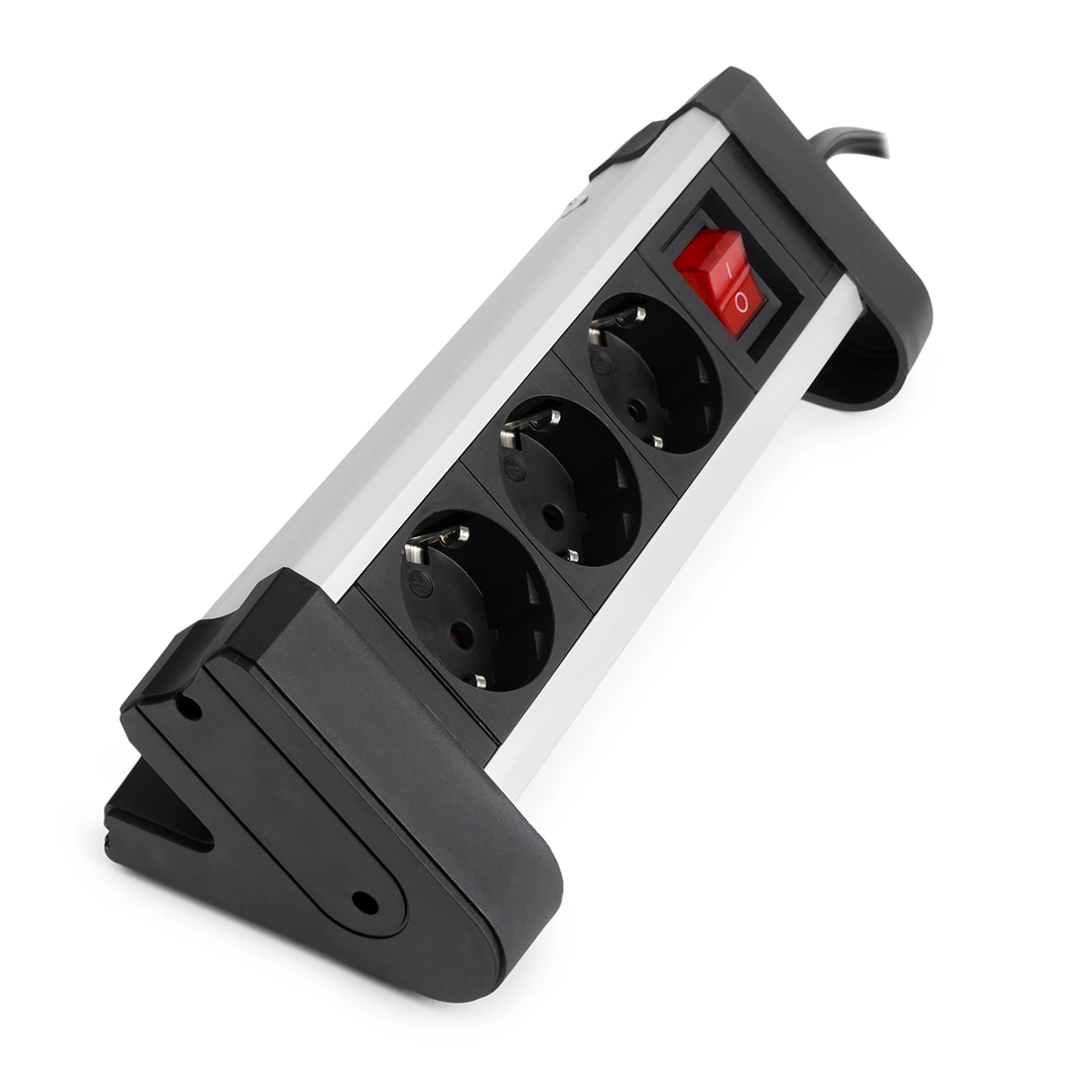 Przedłużacz biurkowy wyróżnia się łatwym montażem, który nie wymaga wycinania otworu w blacie.1. Umieść gniazdo meblowe na krawędzi blatu.