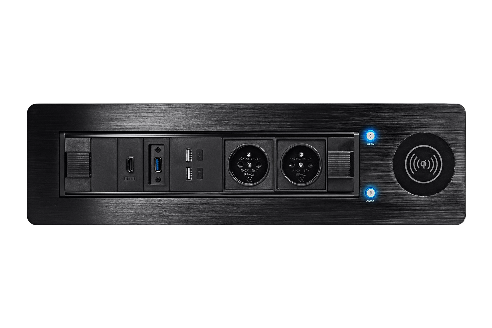 • Stylowy obrotowy mediaport do montażu w blacie. Posiada 2 gniazda elektryczne, podwójną ładowarkę USB, port HDMI, USB 3.0 oraz ładowarkę indukcyjną. 1,5 m kabel zasilający, USB 3.0 oraz HDMI. W kolorze czarnym.