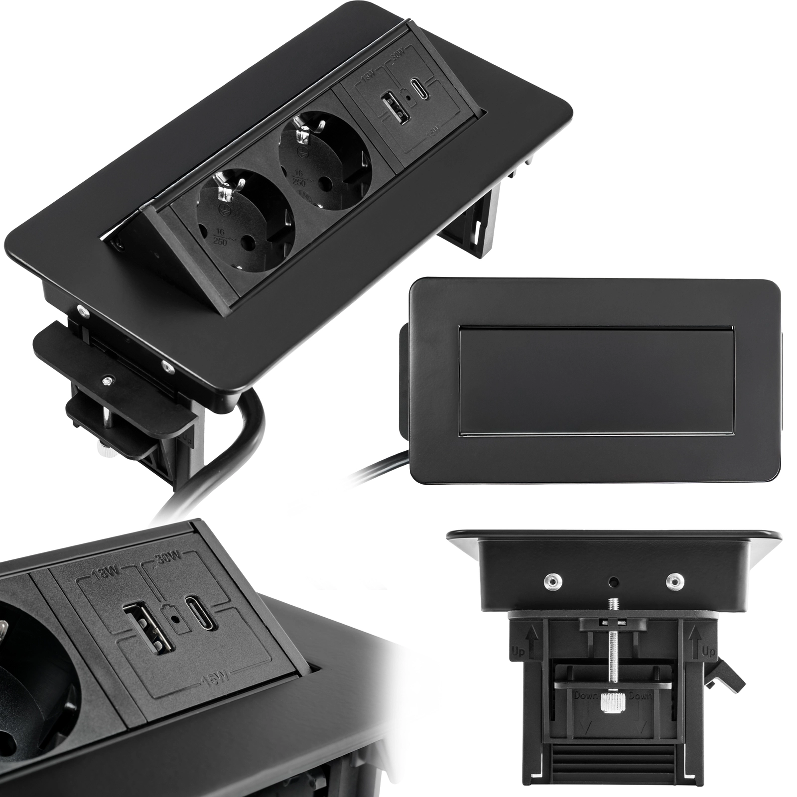 • Postaw na porządek i wygodę. Obrotowe gniazdo Spacetronik ma 2 gniazda Schuko 230 V 50 Hz oraz ładowarkę USB A i USB C. Szybki montaż w blacie 1–6 cm, przewód 1 5 m z wtyczką, eleganckie czarne wykończenie. Idealne do biura i kuchni.
