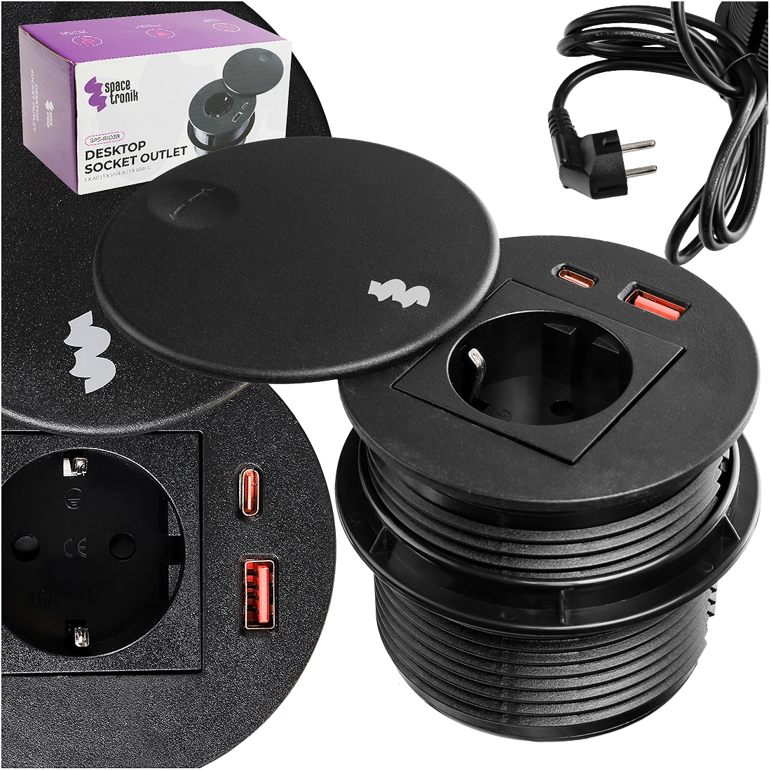 Okrągłe Gniazdo Blatowe Spacetronik SPS-R1D3W V2 Czarne - Funkcjonalność i Elegancja