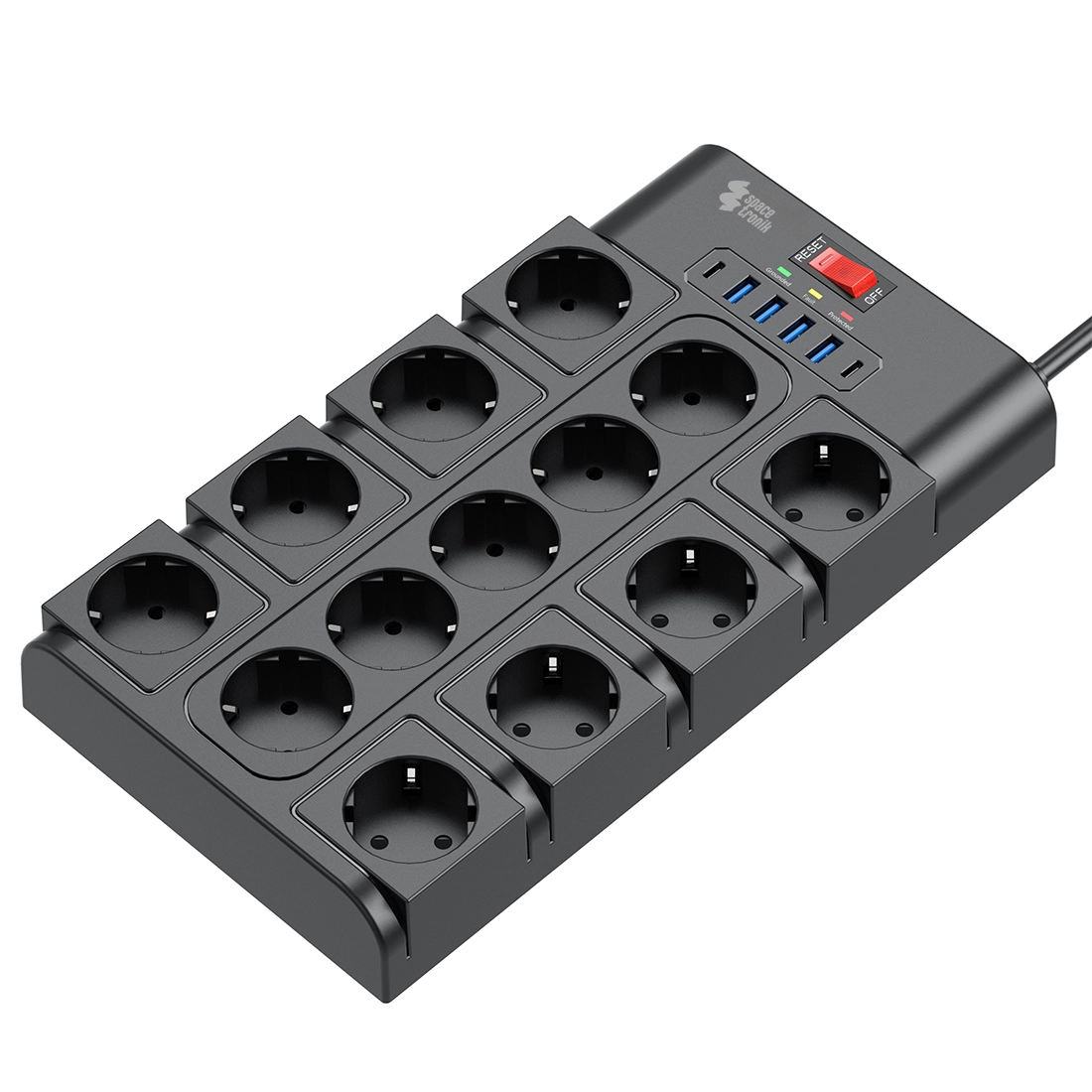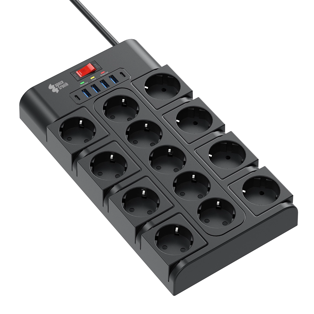Listwa zasilająca Spacetronik SPSPS04B to nowoczesne rozwiązanie dla domu i biura. Wyposażona w aż 13 gniazd AC, 4 porty USB-A i 2 porty USB-C, pozwala na jednoczesne zasilanie wielu urządzeń. Przewód 2 m z miedzi 1,5 mm² gwarantuje stabilne i bezpieczne działanie, a obudowa ABS+PC jest odporna na ogień (750°C). Dzięki ochronie przeciwprzepięciowej 1000J oraz maksymalnemu obciążeniu 3680 W możesz korzystać z niej bez obaw o bezpieczeństwo sprzętu.