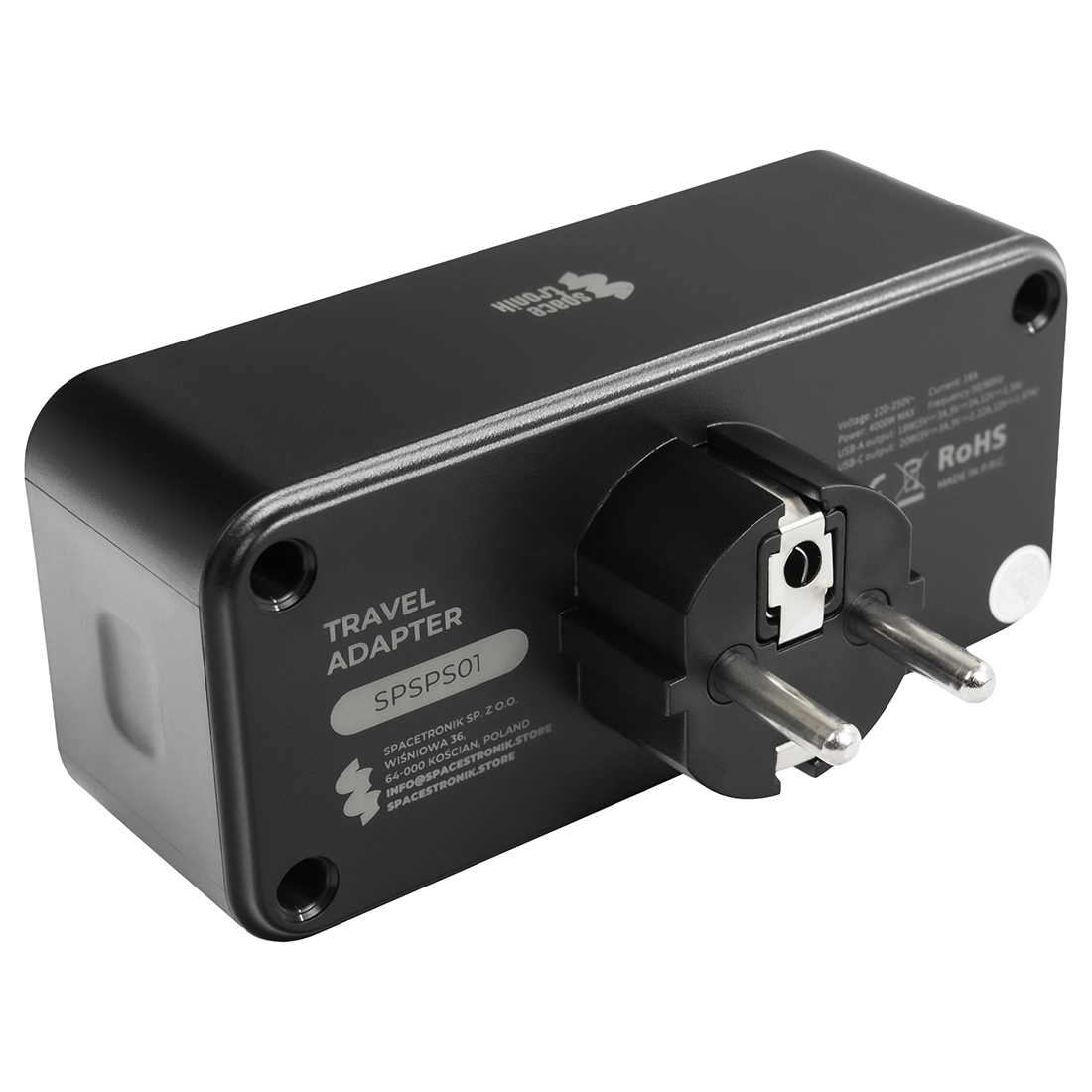 Adapter podróżny - gniazdo wtykowe Spacetronik SPSPS01B z portami USB i USB C do ładowania wielu urządzeń jednocześnie w kolorze Czarnym