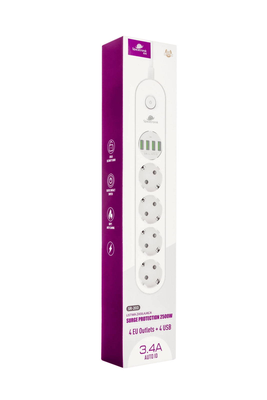 Świat otaczającej nas technologii sprawia, że każdego dnia korzystamy z wielu urządzeń elektronicznych. Potrzebują one oczywiście dostępu do prądu. Warto, więc wyposażyć się w sprzęt, który im to zapewni. Przykładem takiego produktu jest listwa zasilająca Spacetronik SR-203. Jest ona wyposażona w 4 porty AC i 4 porty USB Auto-ID. Dzięki temu można do niej podłączyć większość popularnych urządzeń. Jednocześnie można, więc ładować 8 urządzeń. Ładowarka posiada również funkcje Quick Charge 2.0. Oznacza to, że - urządzenie jest w stanie szybko i efektywnie naładować akumulatory o dużej pojemności. Listwa ma gruby kabel o długości 2m, a tylna ścianka posiada otwory do zawieszenia. Dzięki temu z łatwością umieścisz ją w każdym miejscu.