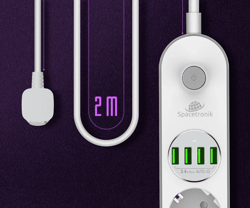 Uniwersalność ładowarki Spacetronik SR-203 zwiększają jeszcze bardziej 4 wbudowane porty USB-A. Dzięki temu będziesz w stanie podładować wszystkie swoje urządzenia akumulatorowe. Niezależnie od tego, czy to telefon, tablet, laptop czy też pad do konsoli. Dodając do tego 4 porty AC, zyskujesz możliwość ładowania nawet do 8 urządzeń elektronicznych. Wszystko po podłączeniu listwy do gniazdka. Listwa zasilająca Spacetronik SR-203 zapewnia Ci 8 razy więcej możliwości niż zwykłe gniazdko zasilania.