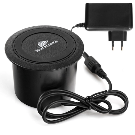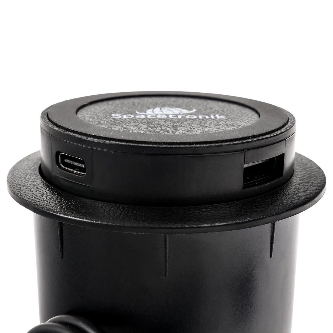 Mediaport Spacetronik ERGOLINE SPS-R0D3B to nowoczesne rozwiązanie, które znajduje zastosowanie w sklepach, salonach sprzedaży, salach konferencyjnych, biurach, a także w domu. Wykonany z wysokiej jakości komponentów. Produkt jest przeznaczony do montażu wewnątrz pomieszczeń w biurkach, blatach i stołach, zarówno w pozycji pionowej jak i poziomej, zapewniając dostęp do gniazd. Ten okrągły mediaport został wyposażony w ładowarkę USB, ładowarkę USB-C oraz ładowarkę indukcyjną