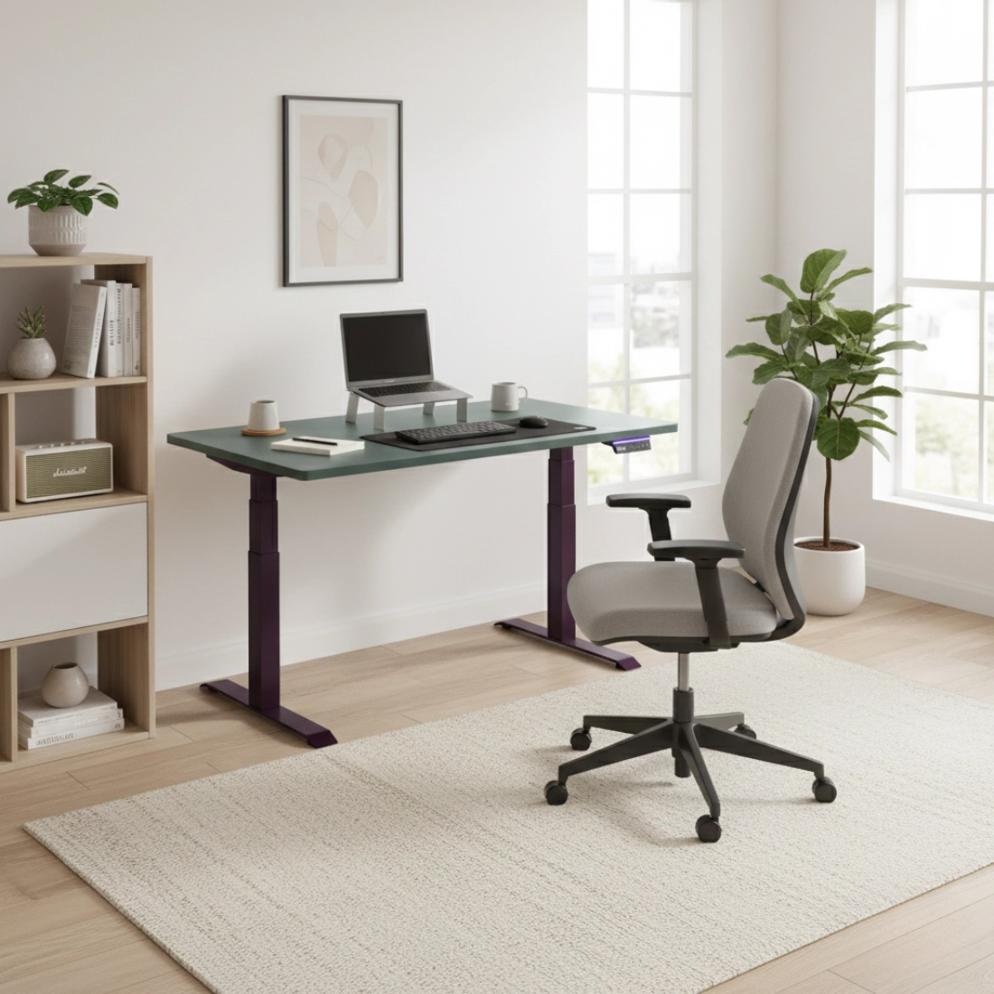 • Ergonomiczne biurko do pracy siedzącej i stojącej: dwusilnikowy stelaż z kontrolerem OLED RGB, pamięcią ustawień i systemem antykolizyjnym oraz blat MDF premium malowany proszkowo – trwały, higieniczny i łatwy w czyszczeniu.