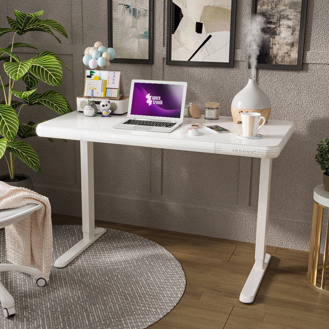 Białe biurko elektryczne z regulacją wysokości i szklanym blatem Spacetronik Astrid SPEB125WG