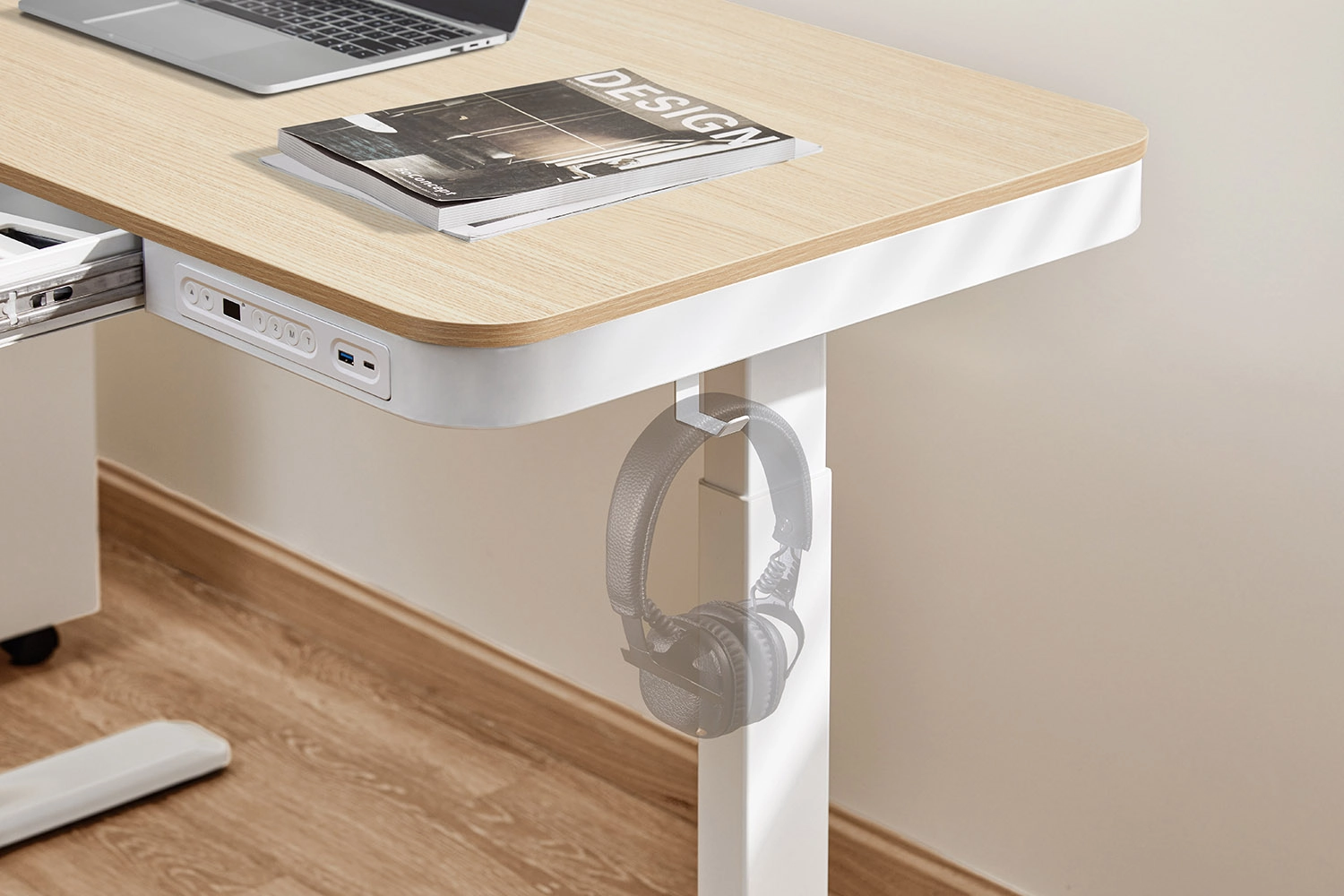 Biurko wyposażone jest w zaawansowany dotykowy kontroler, który umożliwia zapamiętanie ulubionych ustawień wysokości. Dzięki temu, jednym dotknięciem można szybko przestawić biurko do wcześniej zapamiętanych pozycji, co zwiększa wygodę użytkowania. Dodatkowo, kontroler posiada jedno wyjście USB-A, co ułatwia ładowanie urządzeń mobilnych bez potrzeby korzystania z dodatkowych ładowarek. To rozwiązanie pozwala na utrzymanie porządku na blacie i łatwy dostęp do źródła zasilania dla wszystkich potrzebnych urządzeń.