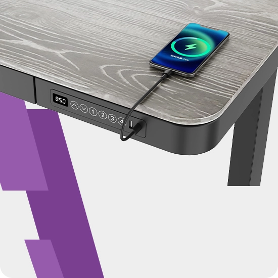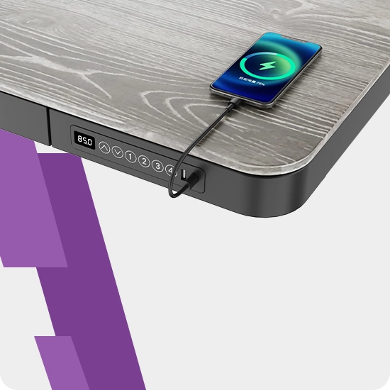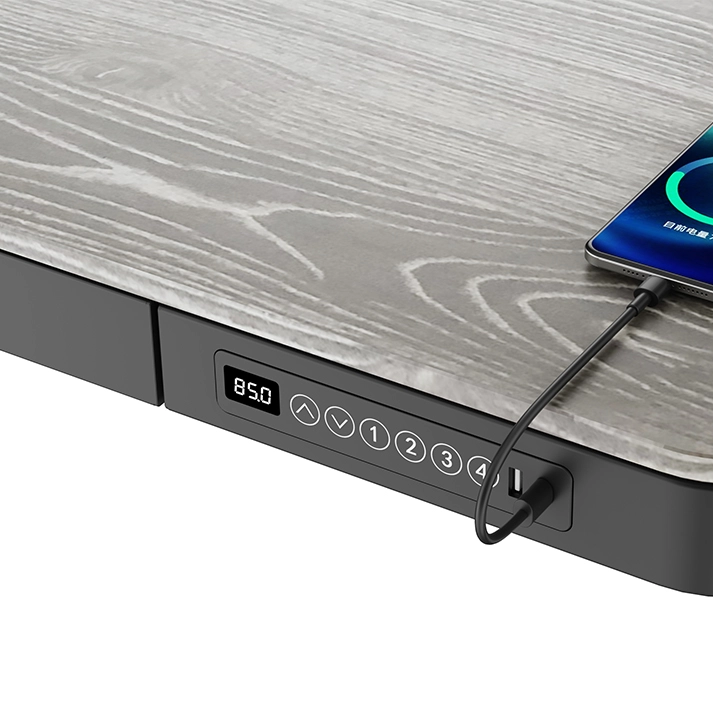 Biurko wyposażone jest w zaawansowany dotykowy kontroler, który umożliwia zapamiętanie ulubionych ustawień wysokości. Dzięki temu, jednym dotknięciem można szybko przestawić biurko do wcześniej zapamiętanych pozycji, co zwiększa wygodę użytkowania. Dodatkowo, kontroler posiada jedno wyjście USB-C, oraz jedno wyjście USB-A, co ułatwia ładowanie urządzeń mobilnych bez potrzeby korzystania z dodatkowych ładowarek. To rozwiązanie pozwala na utrzymanie porządku na blacie i łatwy dostęp do źródła zasilania dla wszystkich potrzebnych urządzeń.
