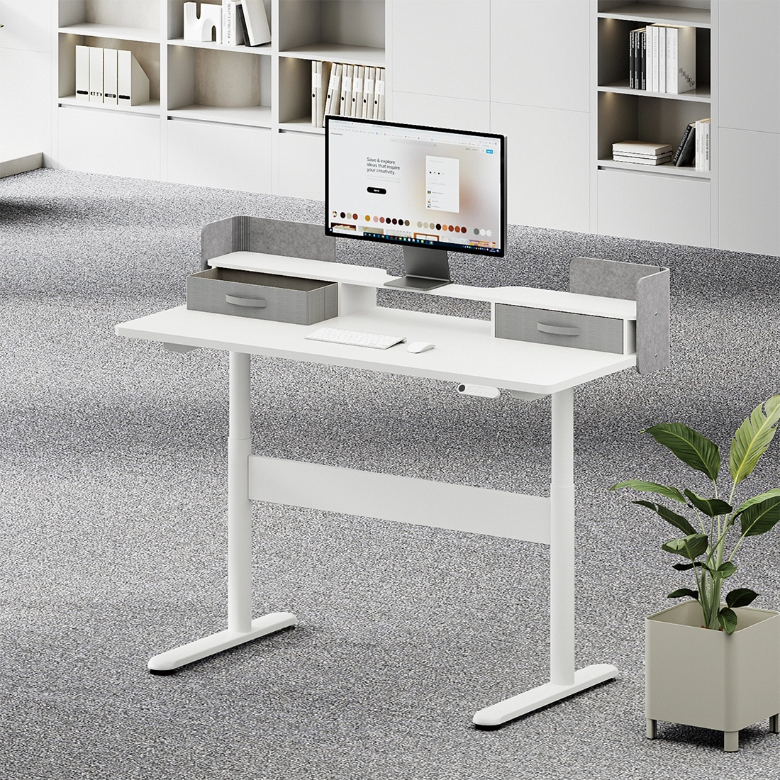 Elegancki wygląd biurka idzie w parze z funkcjonalnością – dzięki dwóm programowalnym ustawieniom wysokości jednym przyciskiem przechodzisz do ulubionej pozycji pracy. Matowe wykończenie i neutralna kolorystyka sprawiają, że pasuje do każdego nowoczesnego biura.