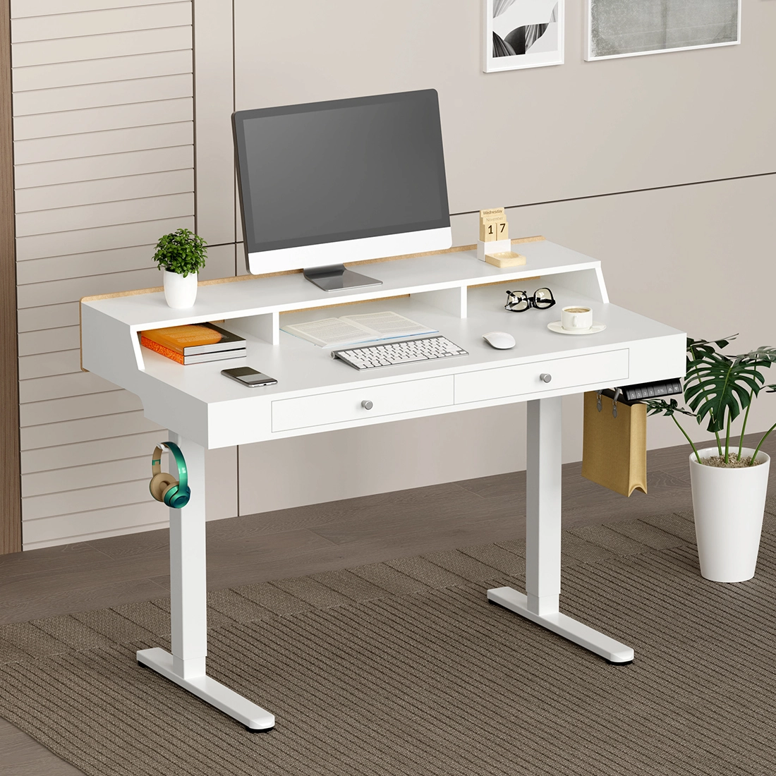 • Biurko Spacetronik SPEF141WL_120_60 z elektryczną regulacją wysokości, podwójnym blatem i wbudowaną szufladą. Pojedynczy silnik zapewnia cichą pracę, a pamięć ustawień i system antykolizyjny zwiększają komfort i bezpieczeństwo.
