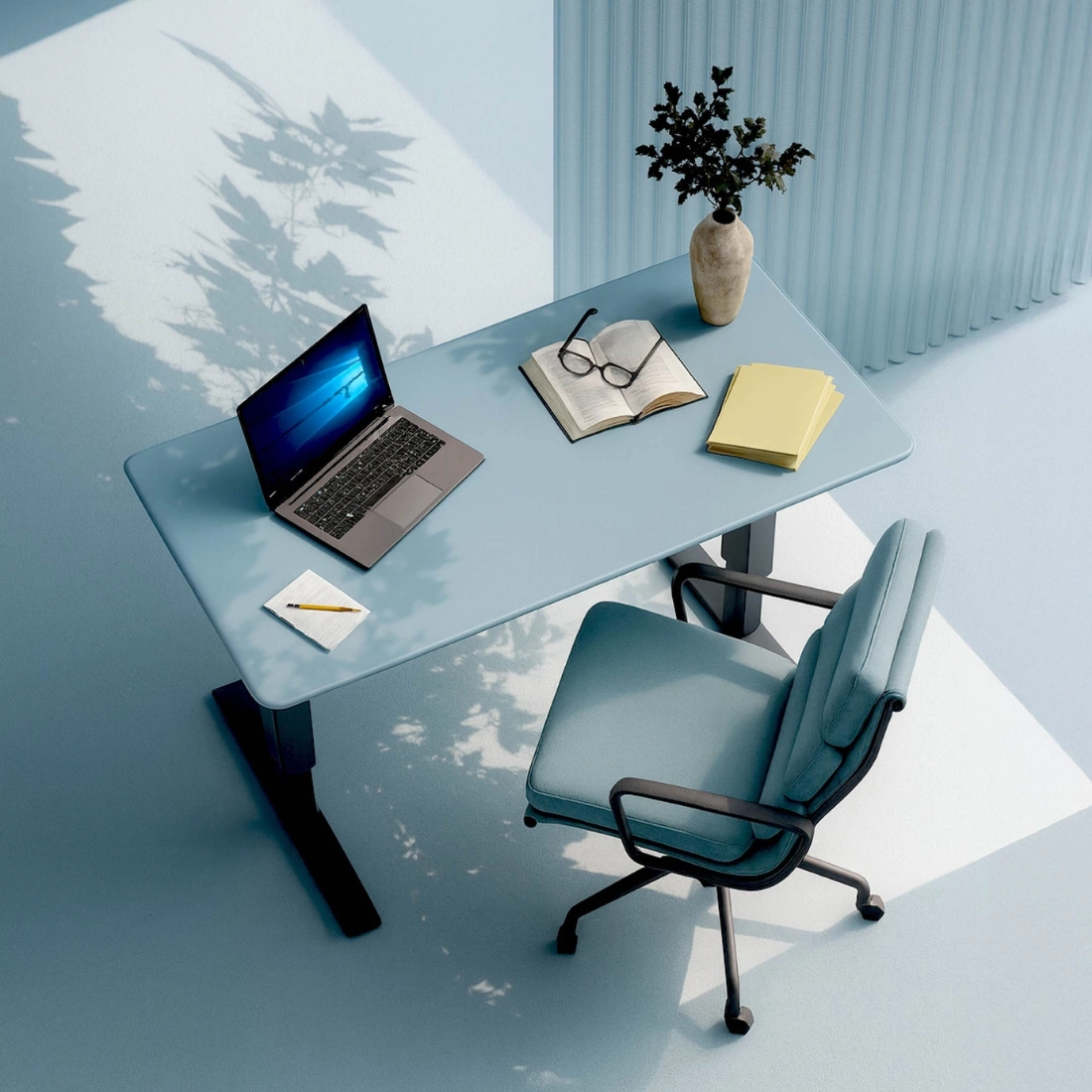 Regularna zmiana wysokości w ciągu dnia odciąża kręgosłup i pomaga utrzymać prawidłową postawę. Dzięki pamięci ustawień wracasz do ulubionych pozycji jednym kliknięciem, a system antykolizyjny wspiera bezpieczne użytkowanie podczas regulacji.