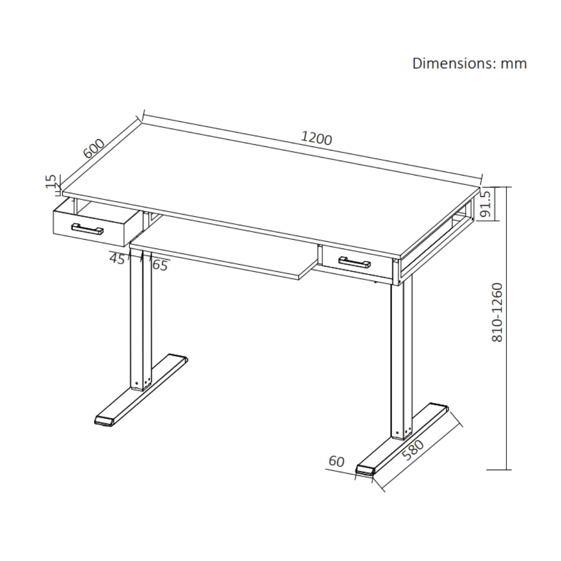 Biurko stojące z regulacją wysokości SPEF122WW_120_60 120×60 – szuflada soft-close i półka na klawiaturę