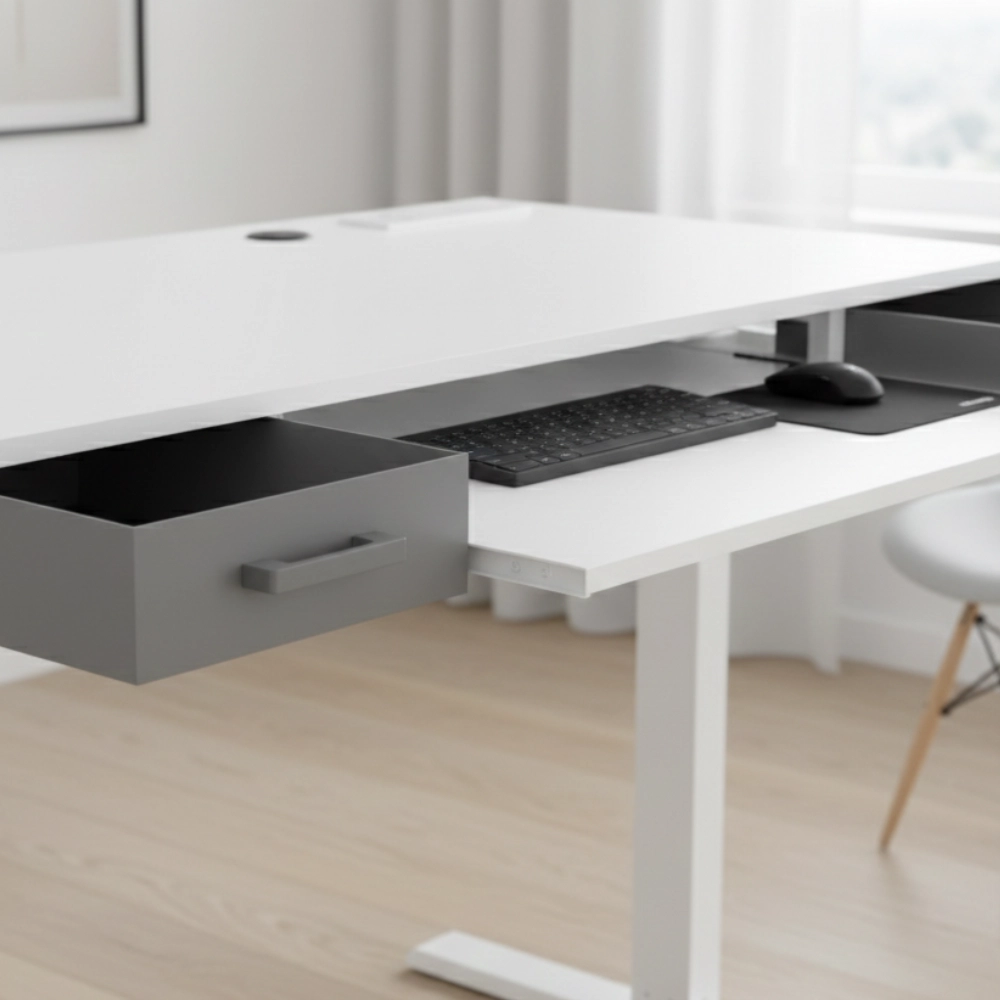 Wbudowana szuflada pod blatem pomaga uporządkować przestrzeń roboczą: schowasz w niej dokumenty, długopisy, notatniki czy dysk zewnętrzny. System soft-close sprawia, że domykanie jest płynne i ciche — bez trzaskania i bez irytujących dźwięków.