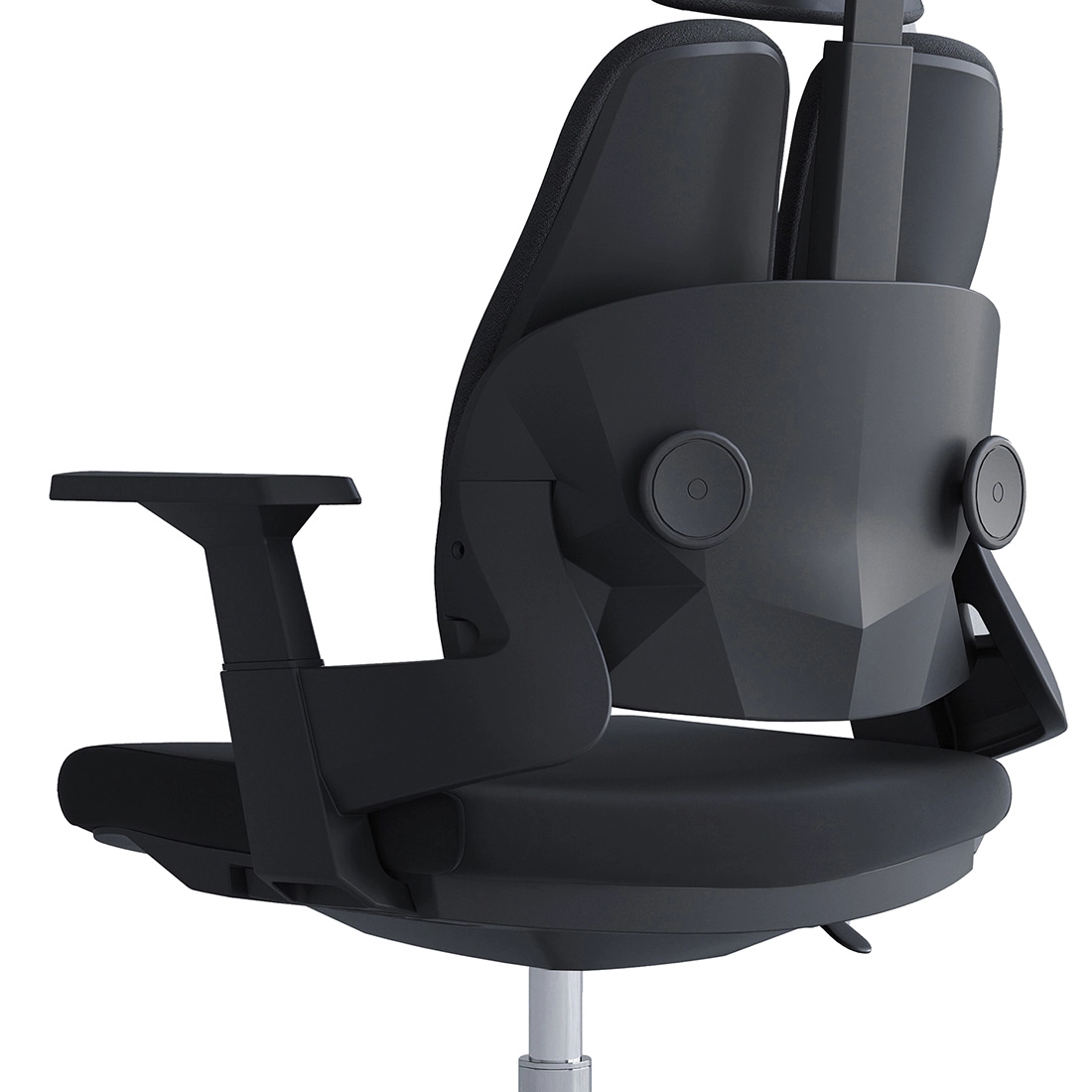 Z tyłu oparcia znajdują się dwa pokrętła, za pomocą których możesz wybrać 3-stopniowy poziom zablokowania ruchu oparcia. W trybie aktywnego oparcia obie jego części będą na bieżąco zmieniać swoje ustawienie względem tego, jak siedzisz. Zapewnia to inteligentne wsparcie dla Twojego rdzenia kręgowego. Wyprofilowane oparcie fotela biurowego zapewnia komfort nawet podczas długich godzin spędzonych przy biurku.