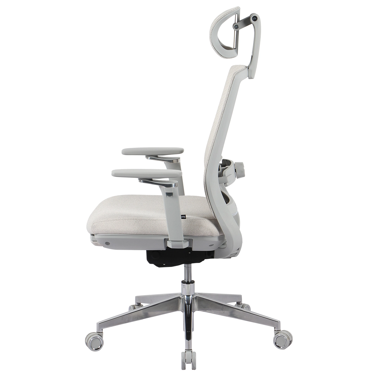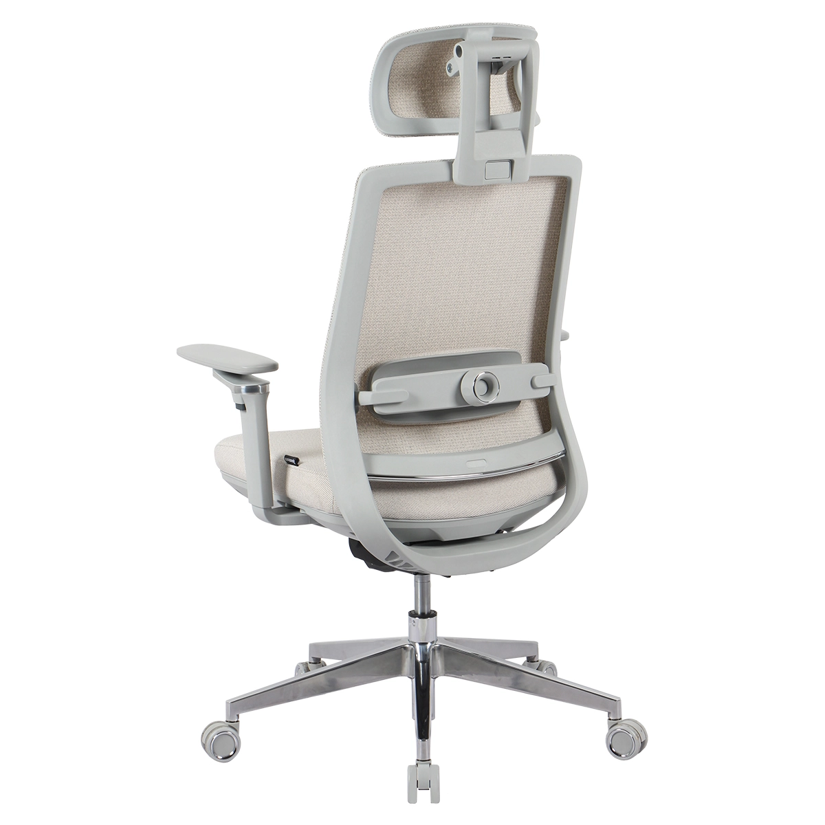 5 ramienna podstawa krzesła została wykonana z wysokiej jakości stali chromowanej o średnicy 64,5cm. Taka konfiguracja zapewnia najwyższy poziom stabilności fotela. Dzięki wykorzystaniu miękkich kółek w kolorze szarym o średnicy 6cm ograniczamy zużycie paneli, dywanów oraz innych powierzchni.