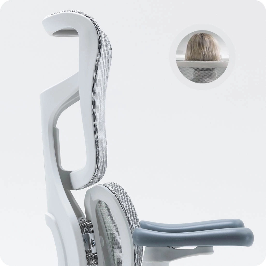 Przedzielenie oparcia na dwie części pozwoliło na nowe rozwiązania projektowe. Jednym z nich jest rezygnacja ze standardowego zagłówka. Zamiast tego wykorzystano w tym górną krawędzi wyprofilowanego oparcia. Zostało ono odpowiednio zagięte, żebyś mógł komfortowo opierać głowę na całej jego szerokości. Dzięki temu przestrzeń na nią jest większa niż w przypadku zwyczajnych zagłówków. Takie rozwiązanie jest możliwe z uwagi na to, że oparcie fotela oferuje zmianę wysokości. Każdy więc będzie mógł dopasować fotel w taki sposób, by był dla niego jak najwygodniejszy.