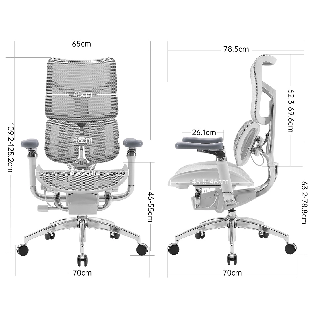 - Podłokietnik - Regulowany 6D (Góra - dół 6,5 cm, przód - tył 4,5 cm, pochył na boki - 72°, pionowo 35°, przesunięcie poziome 8 cm, zsynchronizowane z oparciem)