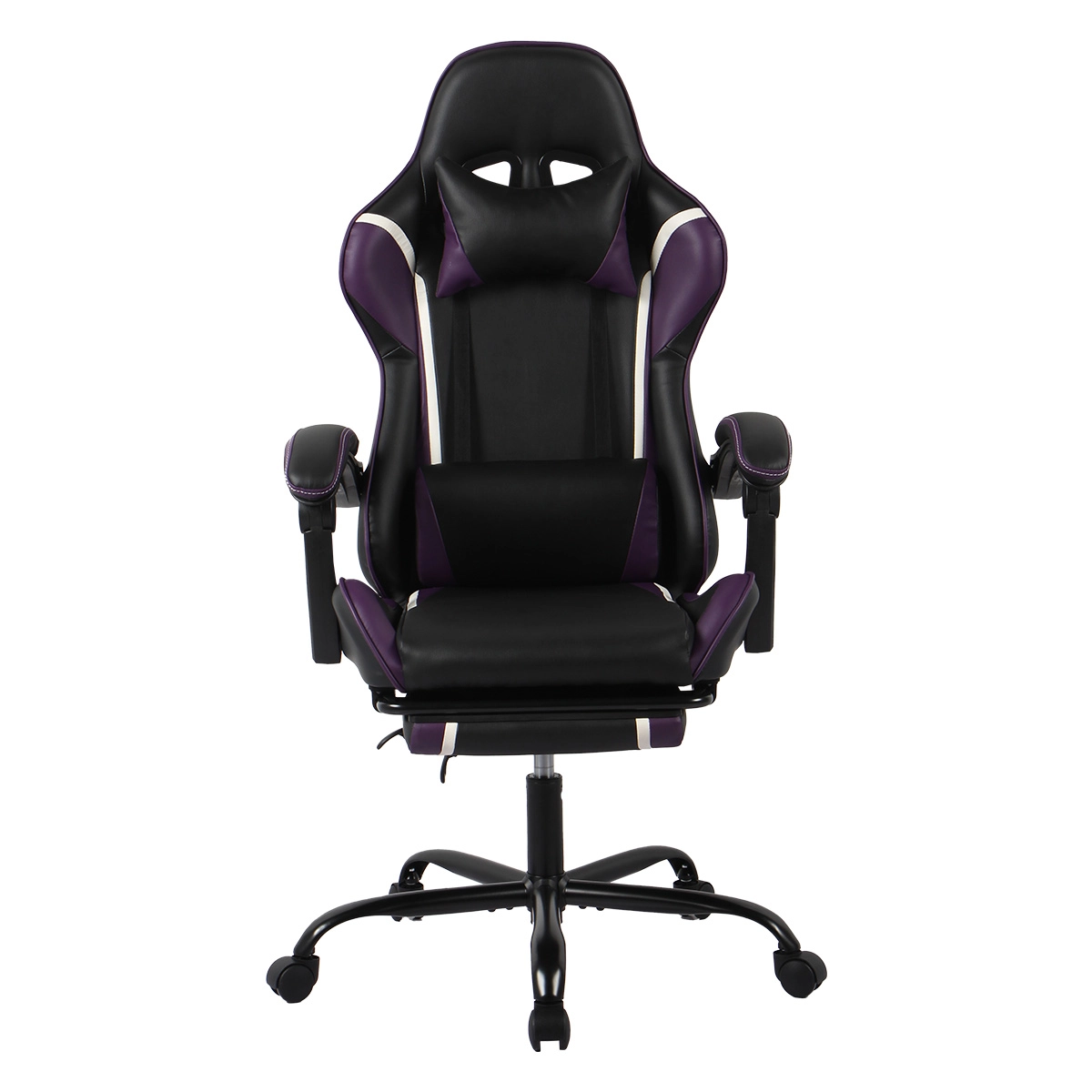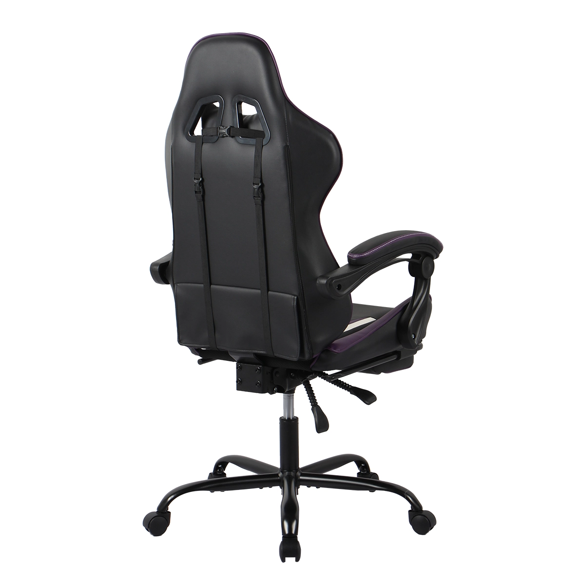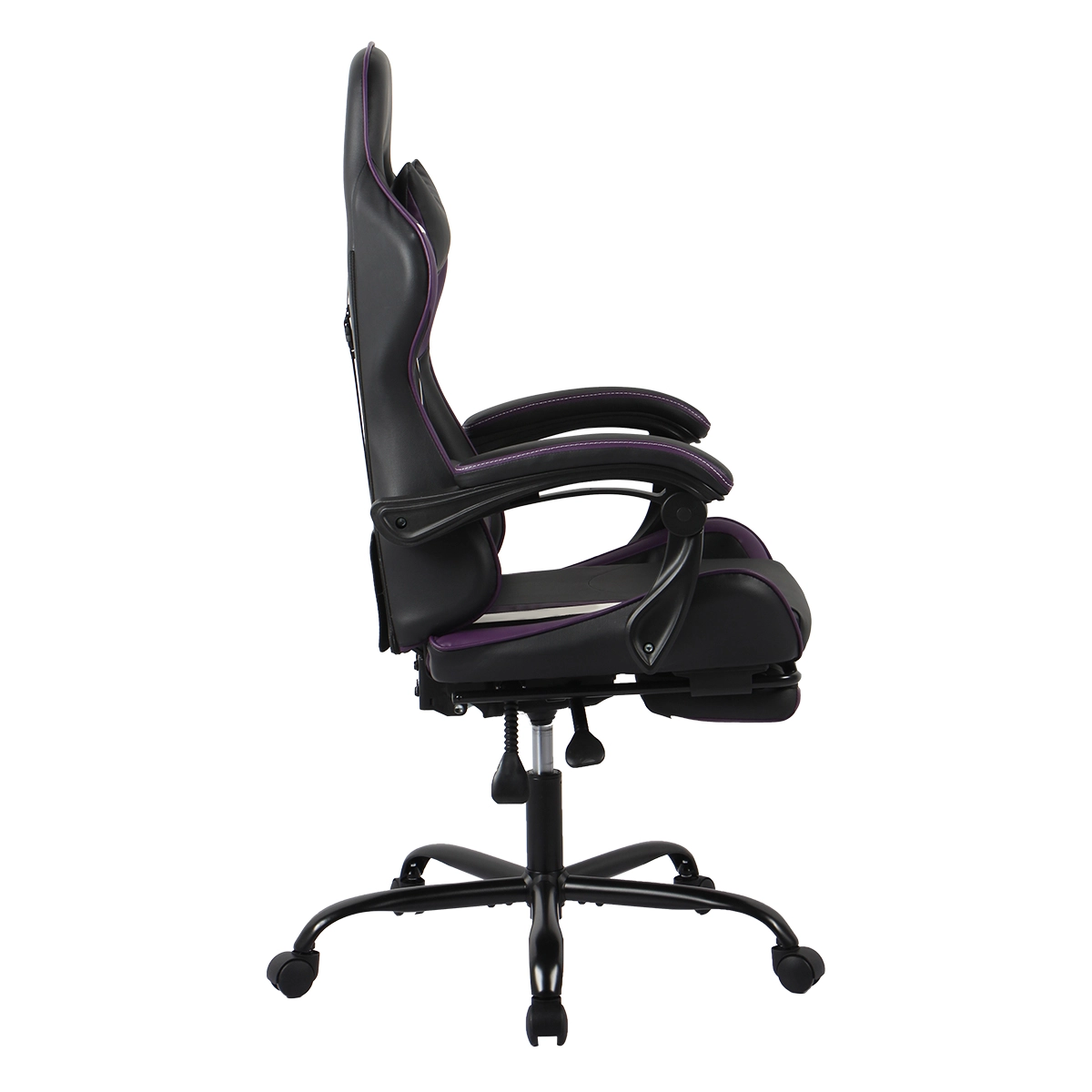 • Wygodne krzesło do biura i domu. Wyposażone w wysuwany podnóżek oraz poduszki pod odcinek lędźwiowy oraz kark. Krzesło obszyte skórą PU, siedzisko z gęstej komfortowej pianki. Kolor czarno-fioletowy.