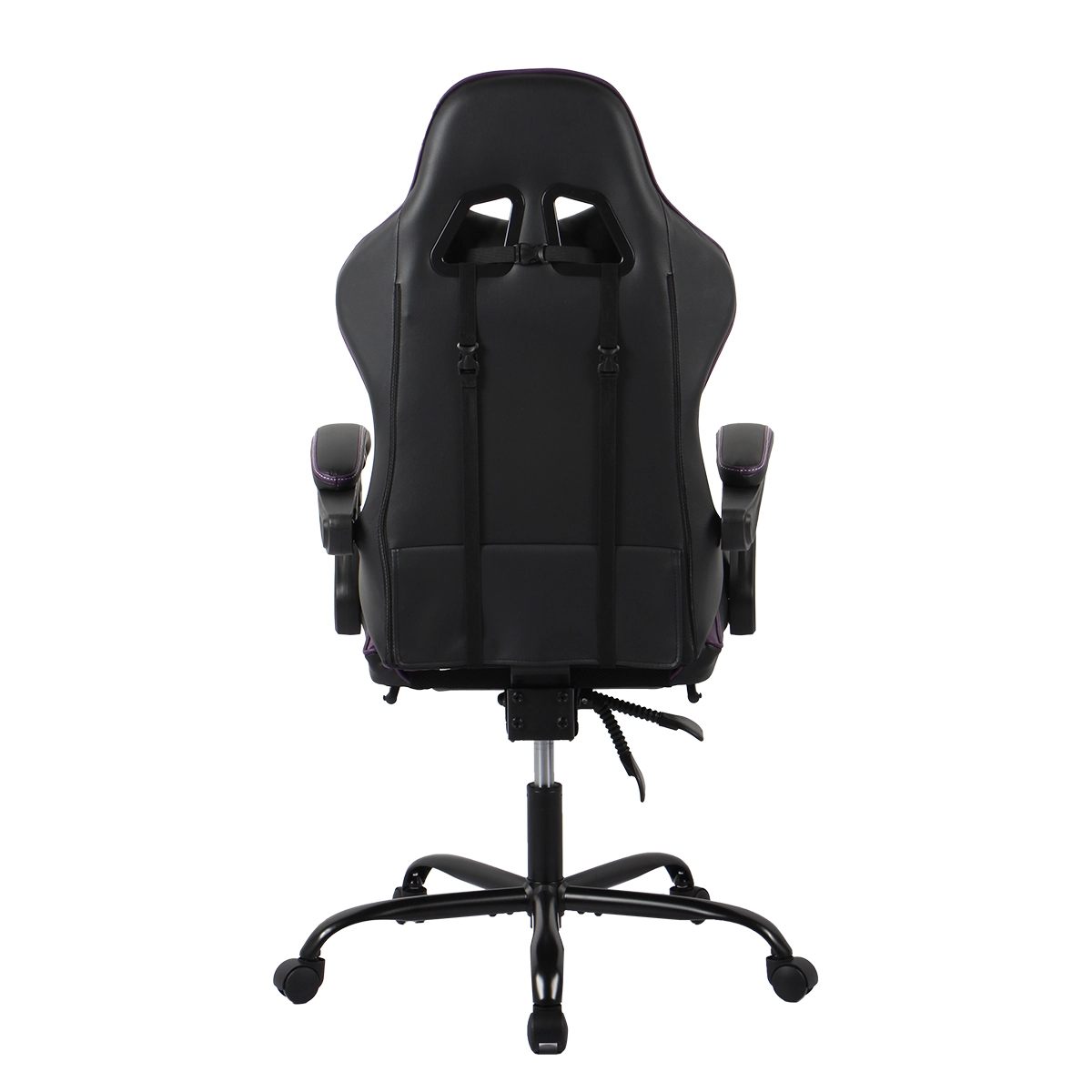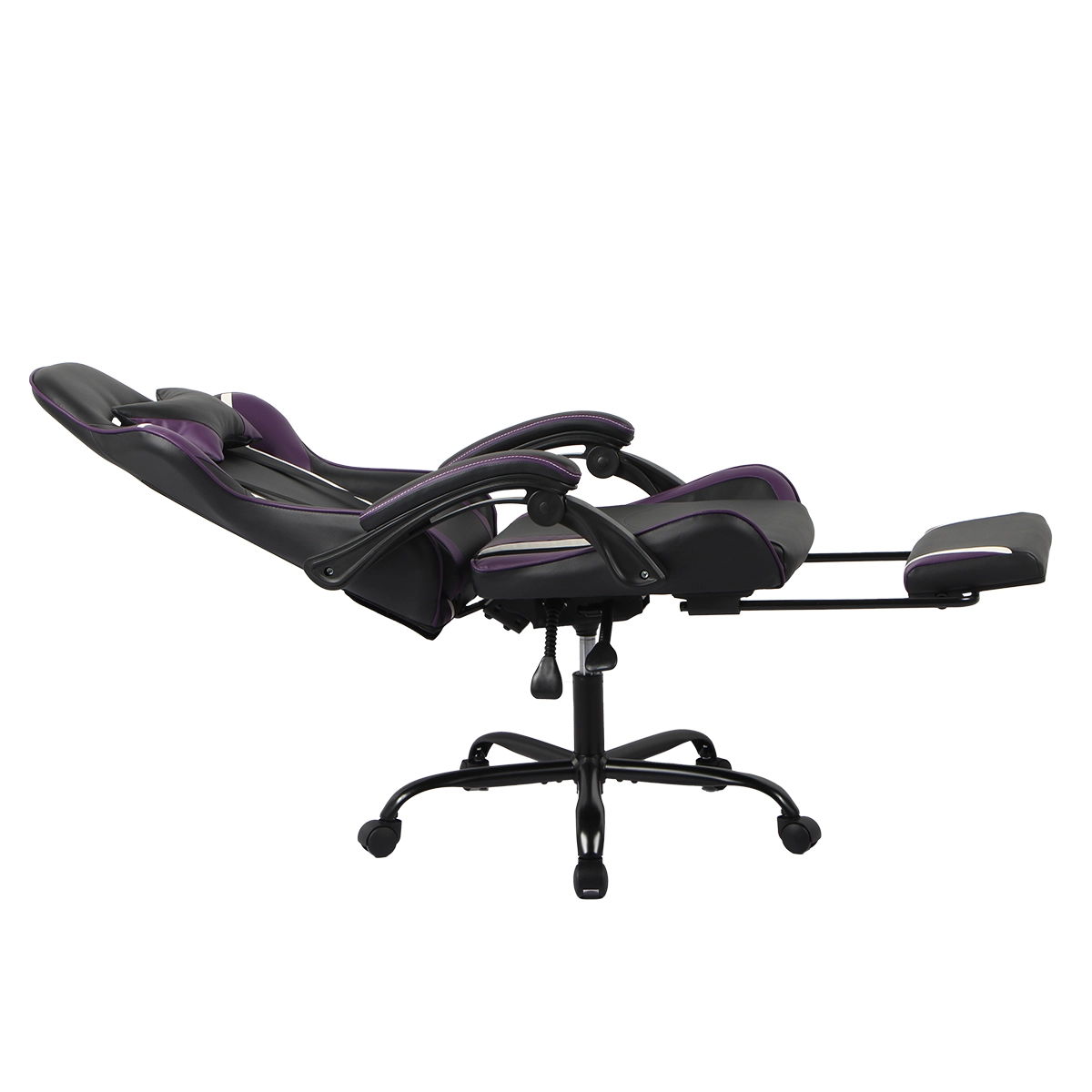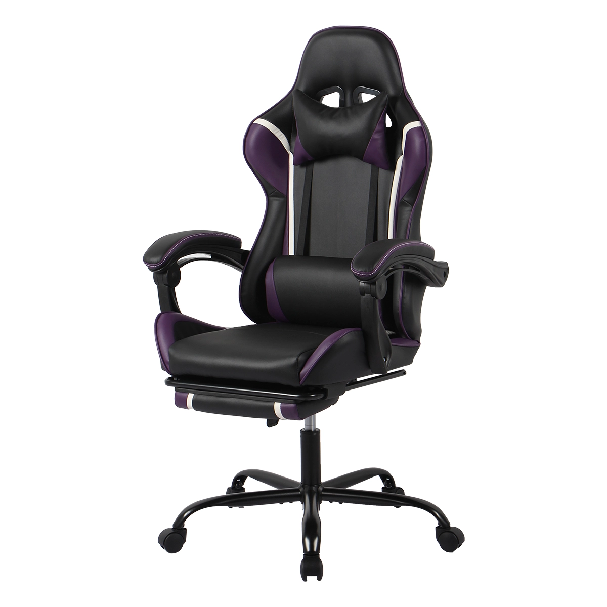• Wygodne krzesło do biura i domu. Wyposażone w wysuwany podnóżek oraz poduszki pod odcinek lędźwiowy oraz kark. Krzesło obszyte skórą PU, siedzisko z gęstej komfortowej pianki. Kolor czarno-fioletowy.