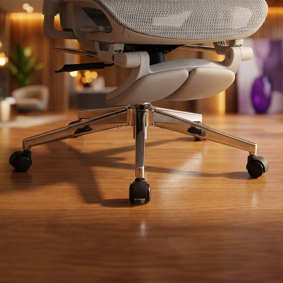Kółka — 5 kółek z tworzywa sztucznego, zapewniają płynne i ciche przemieszczanie się krzesła oraz stabilność podczas codziennego użytkowania na różnych typach podłoża.