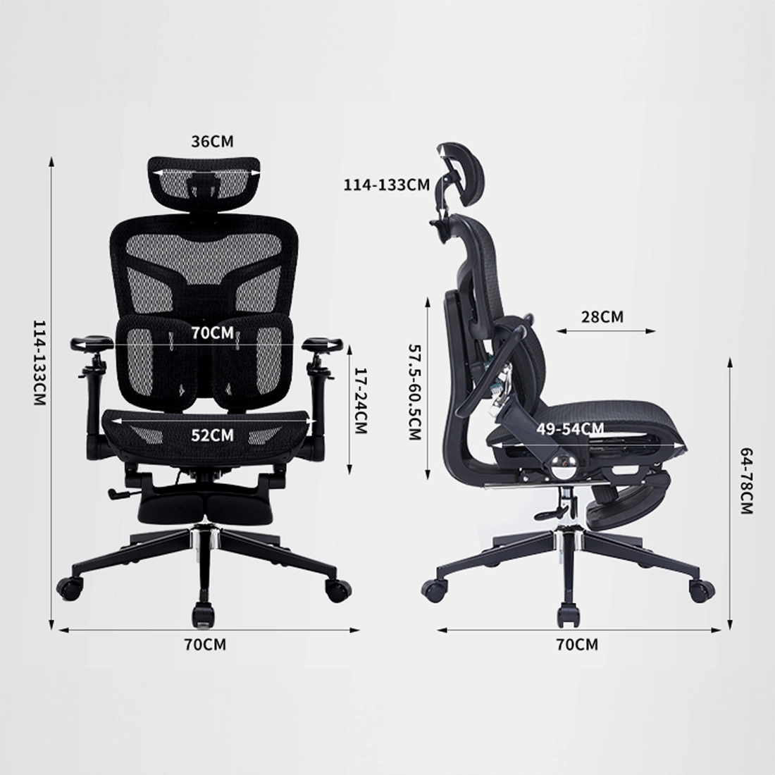 Zakres regulacji — 114–133 cm (19 cm), szeroki zakres regulacji wysokości umożliwia precyzyjne dopasowanie krzesła do wzrostu użytkownika oraz wysokości biurka, zapewniając ergonomiczną i zdrową pozycję siedzenia.