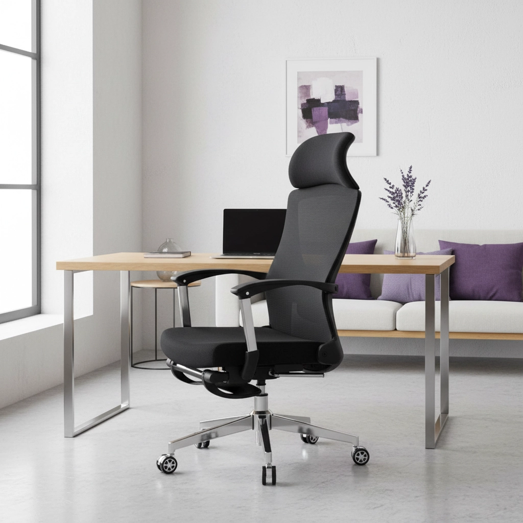Wysoka jakość elementów, z których został wykonany fotel do biurka, przekłada się na prestiżowy efekt wizualny. Zastosowanie oddychającej siatki zapewnia dodatkową cyrkulację powietrza, maksymalizując komfort użytkowania. Siedzisko oraz zagłówek zostały wyściełane przyjemną tkaniną z pianką o wysokiej gęstości wewnątrz.