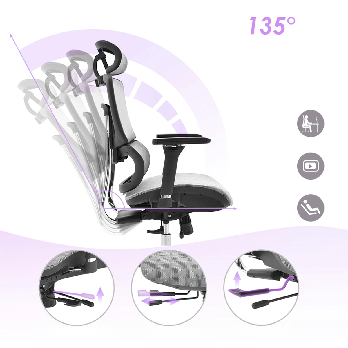 • Biurowe, ergonomiczne krzesło obrotowe. Regulowana wysokość 114 - 132 cm, podłokietnik 4D, zagłówek 3D i wsparcie lędźwiowe. Kolor Czarno - szary.